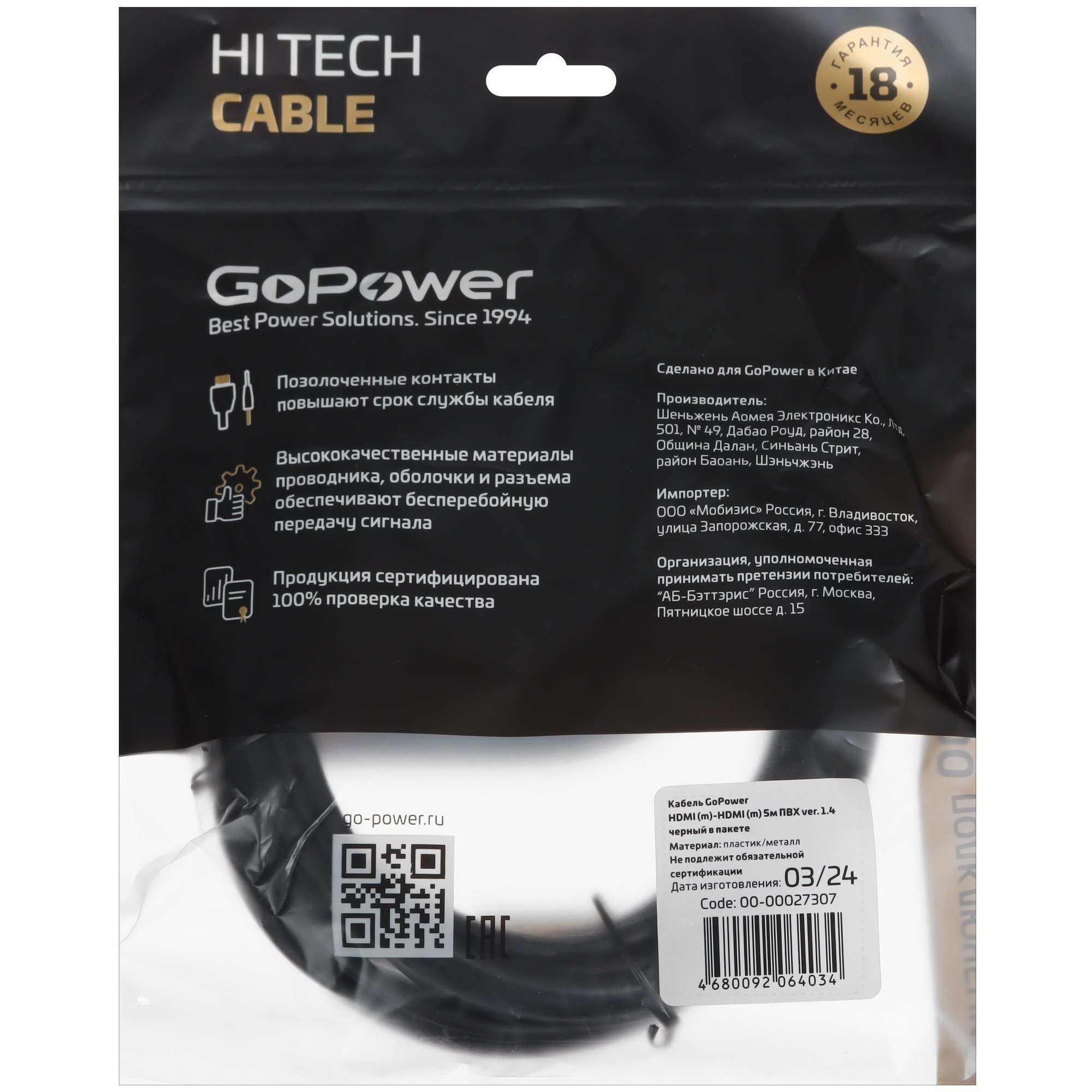 Кабель GoPower HDMI (M)-HDMI (M) 5.0M 00-00027307 черный