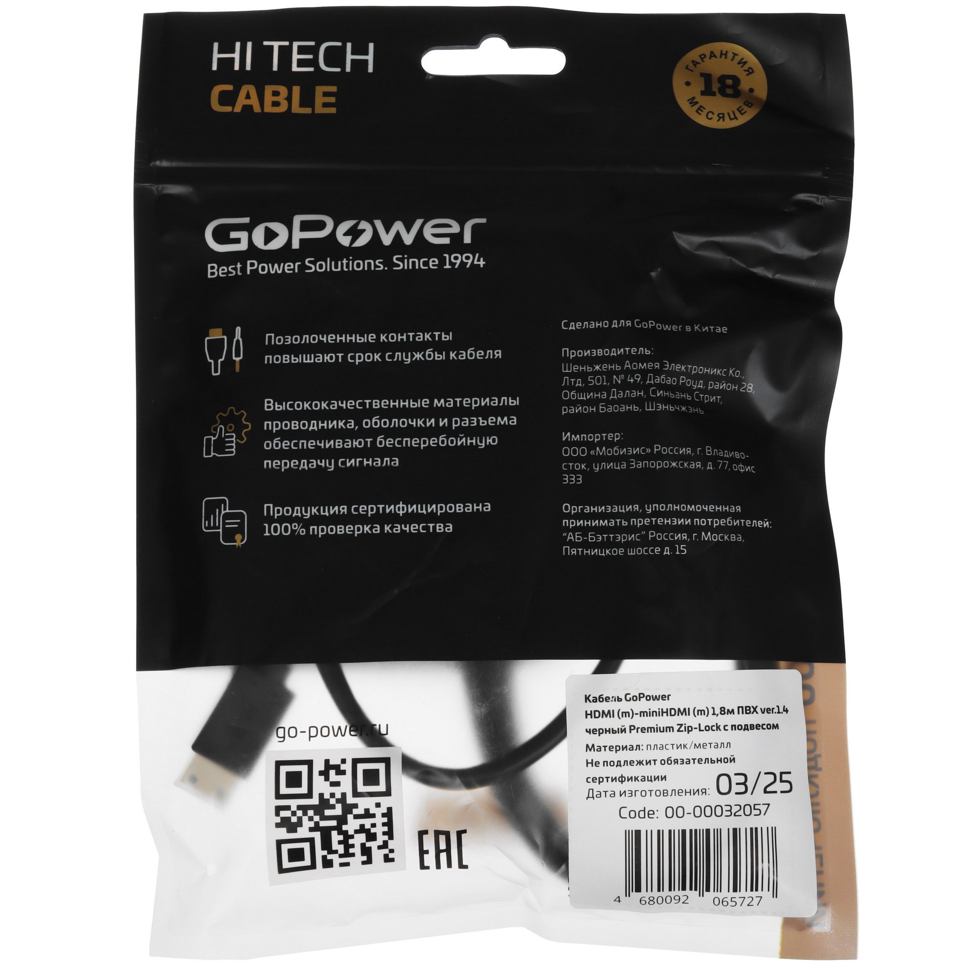 Кабель GoPower HDMI (m)-miniHDMI (m) 1,8м ПВХ ver.1.4 черный Premium Zip-Lock c подвесом (1/100)