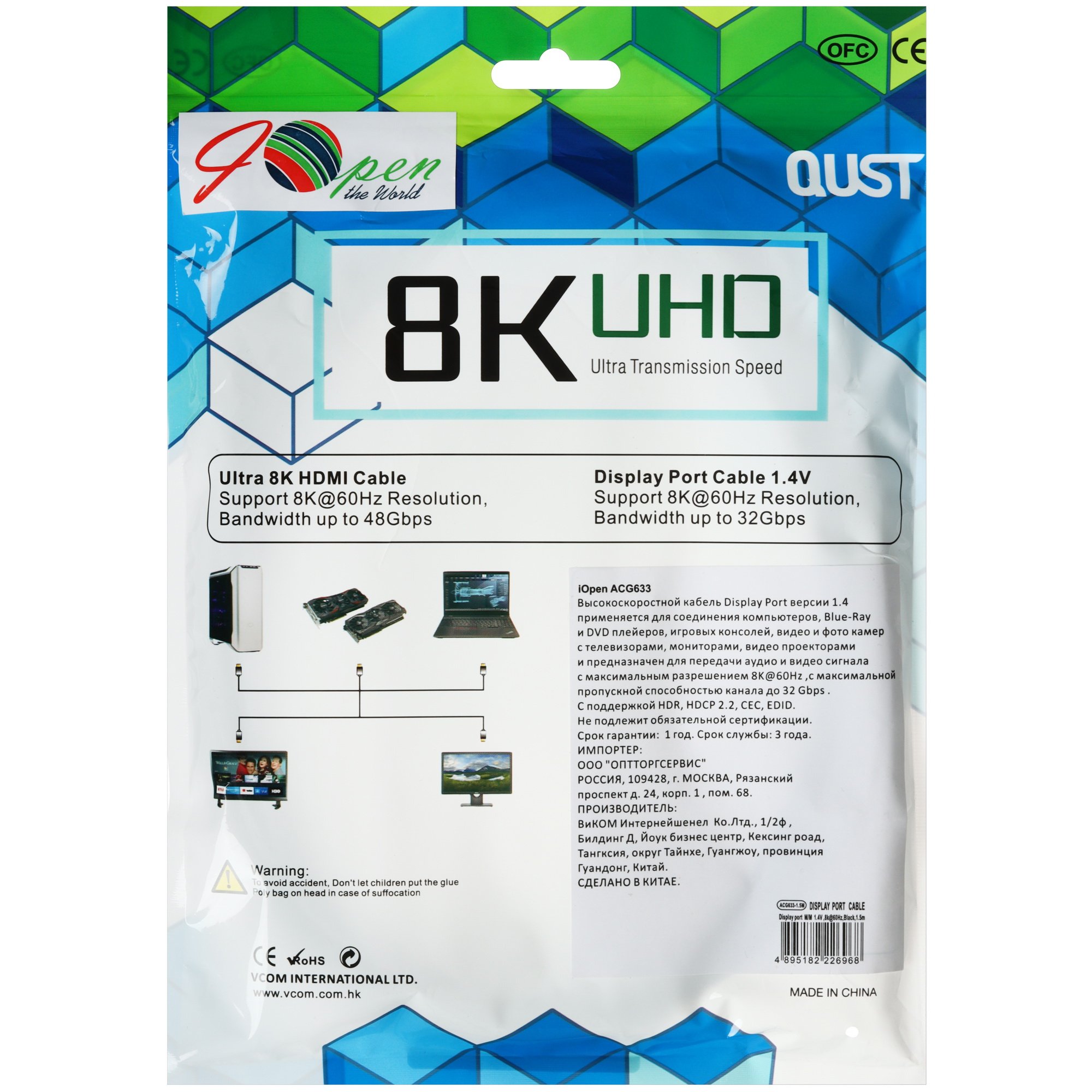 Кабель соединительный DISPLAY PORT v1.4, 8K@60Hz, 1.5m iOpen (Aopen/Qust) ACG633-1.5M