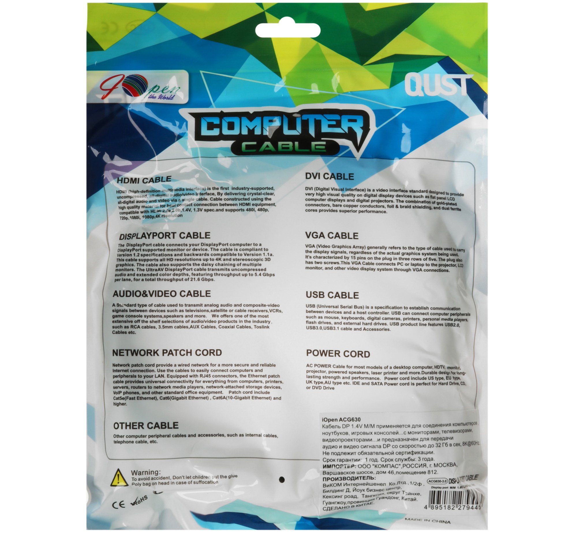 Кабель iOpen DisplayPort – DisplayPort служит для телекоммуникационной передачи данных через интерфейс DP. Основной цвет кабеля iOpen – серый.