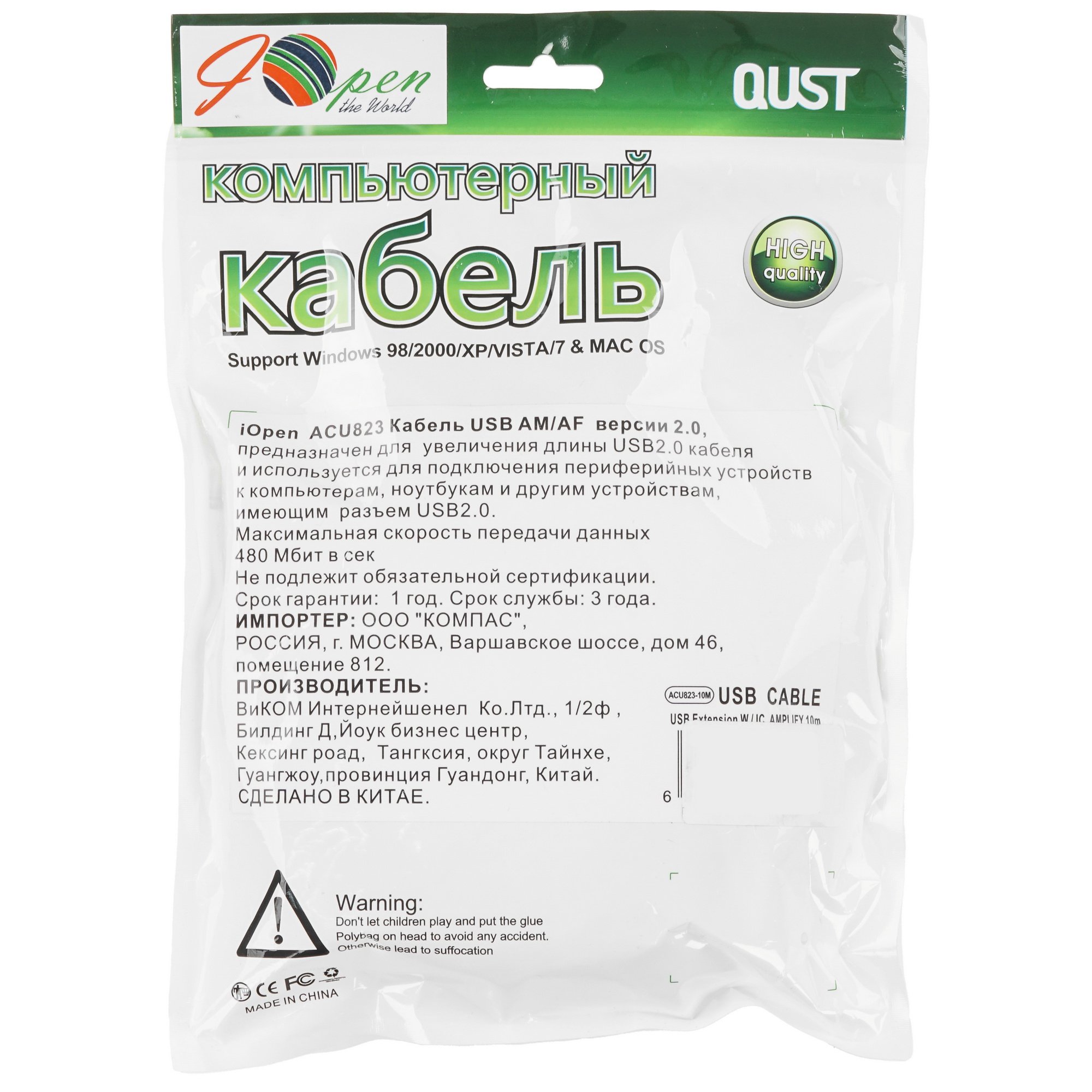 Кабель AM/AF USB2.0 10м AOpen удлинитель активный(с усилителем) USB2.0-repeater, ACU823-10M