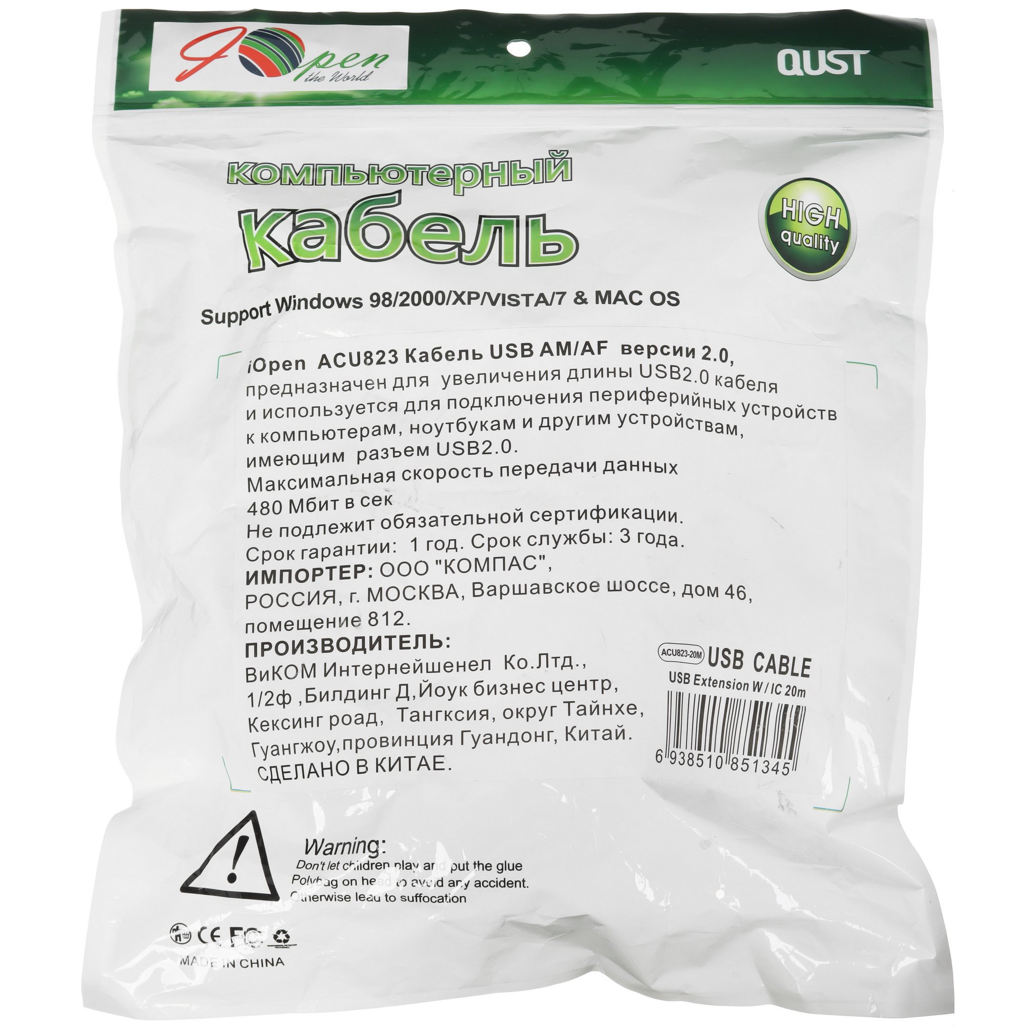 Кабель-адаптер Aopen/Qust USB2.0-repeater, удлинительный активный Am-->Af 20м (ACU823-20M) 6938510851345