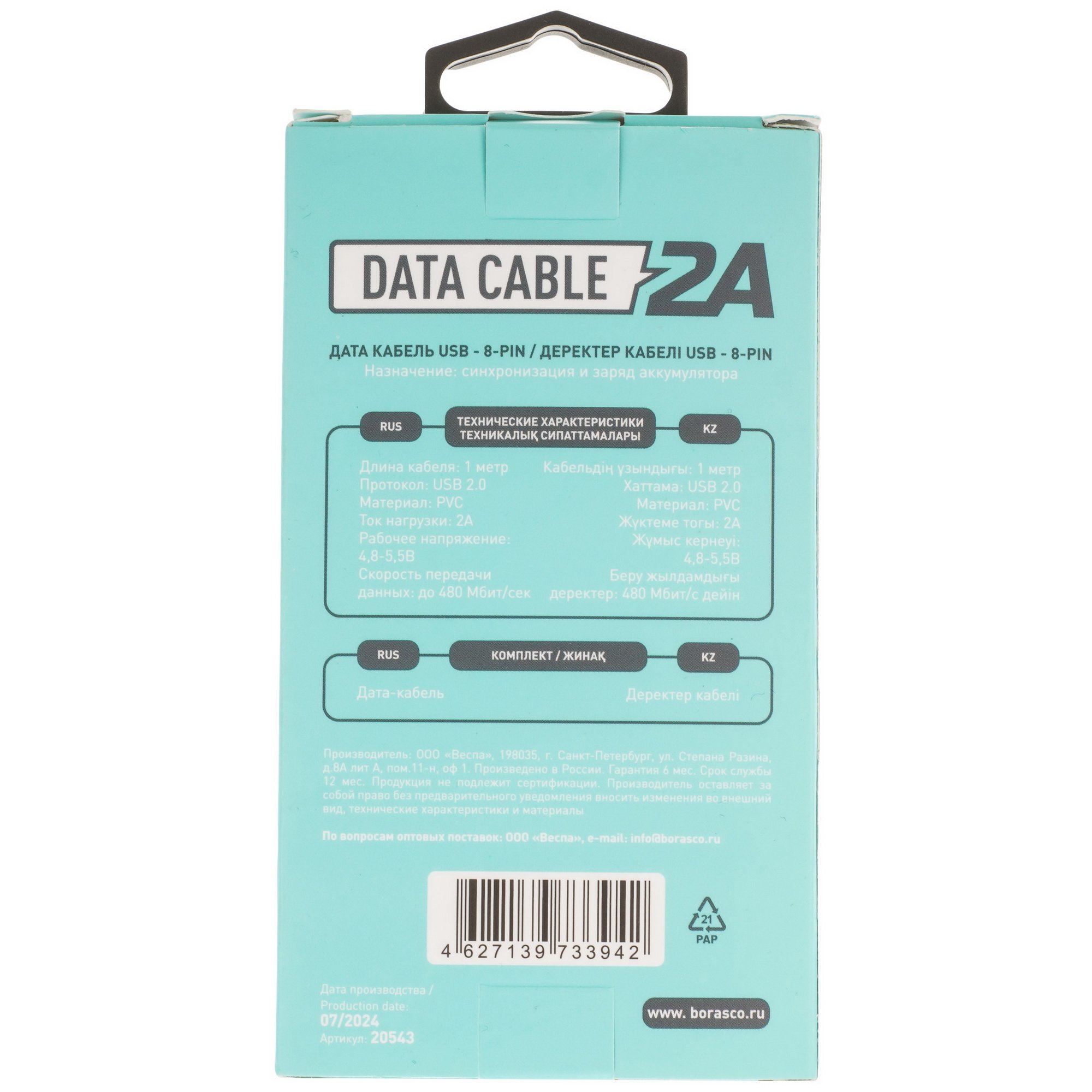 Проводники кабеля Borasco Lightning 8-pin - USB 2.0 Type-A изготовлены из меди и защищены общей гибкой изоляцией из износостойкого материала – ПВХ. Эластичная, но прочная оболочка предохраняет провода от перегибов, изломов, замыканий. Кабель в сечении имеет круглую форму.
