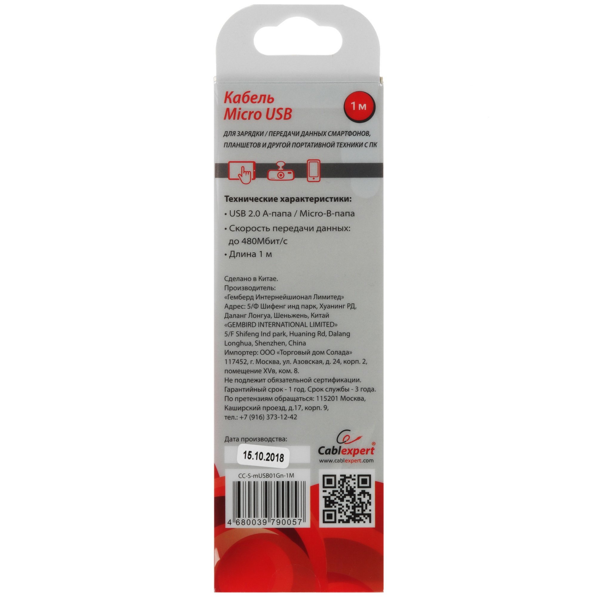 Кабель круглый Cablexpert micro USB - USB 2.0 Type-A поддерживает скорость обмена данными до 480 Мбит/с. Изделие защищено от механических повреждений оплеткой из силикона. Длина кабеля – 1 м.