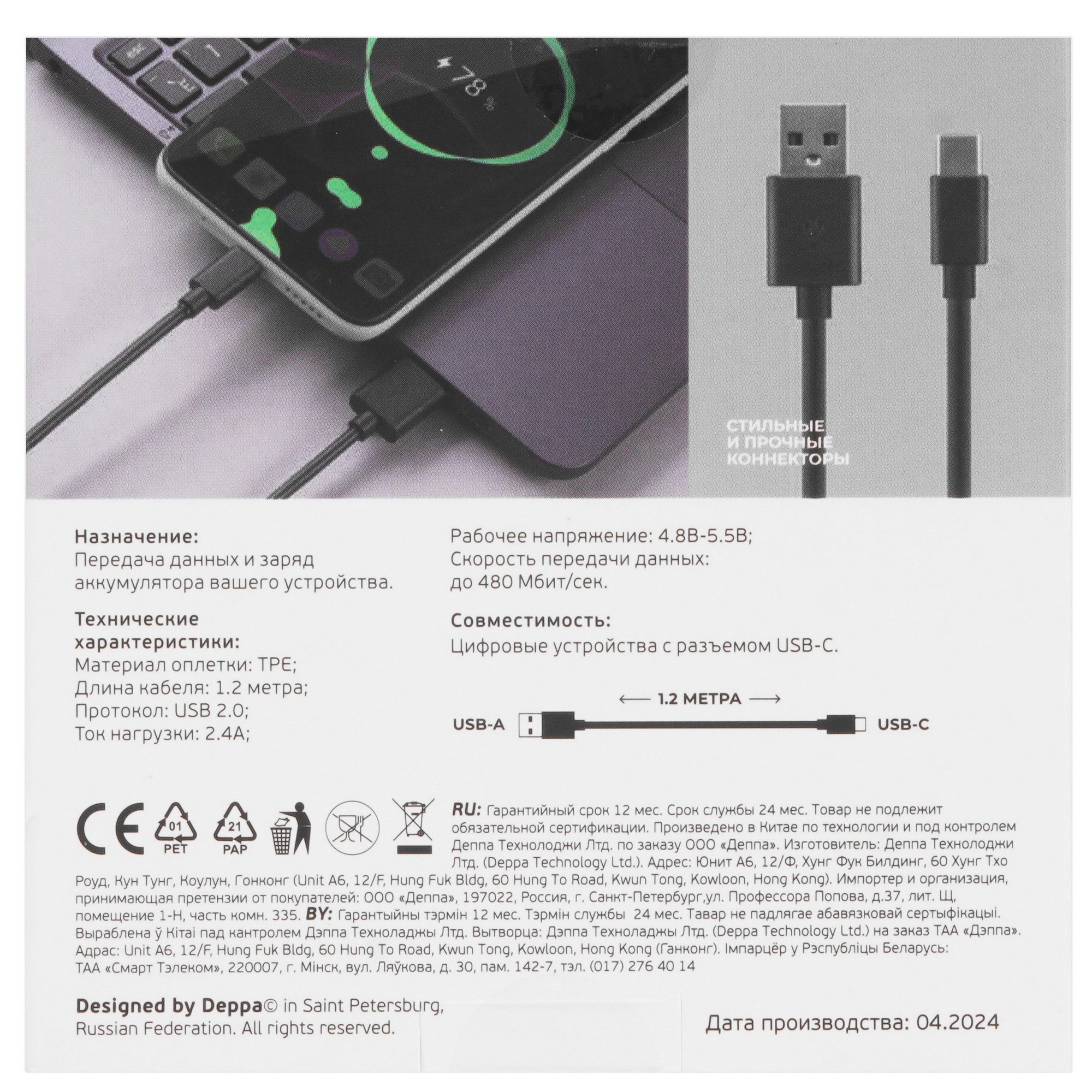Кабель круглый DEPPA USB Type-C - USB 2.0 Type-A черный используется при передаче данных и зарядке аккумуляторов смартфонов, планшетов и других устройств. Скорость обмена информацией ограничена 60 МБ/с. Максимальный ток зарядки – 2.4 А.