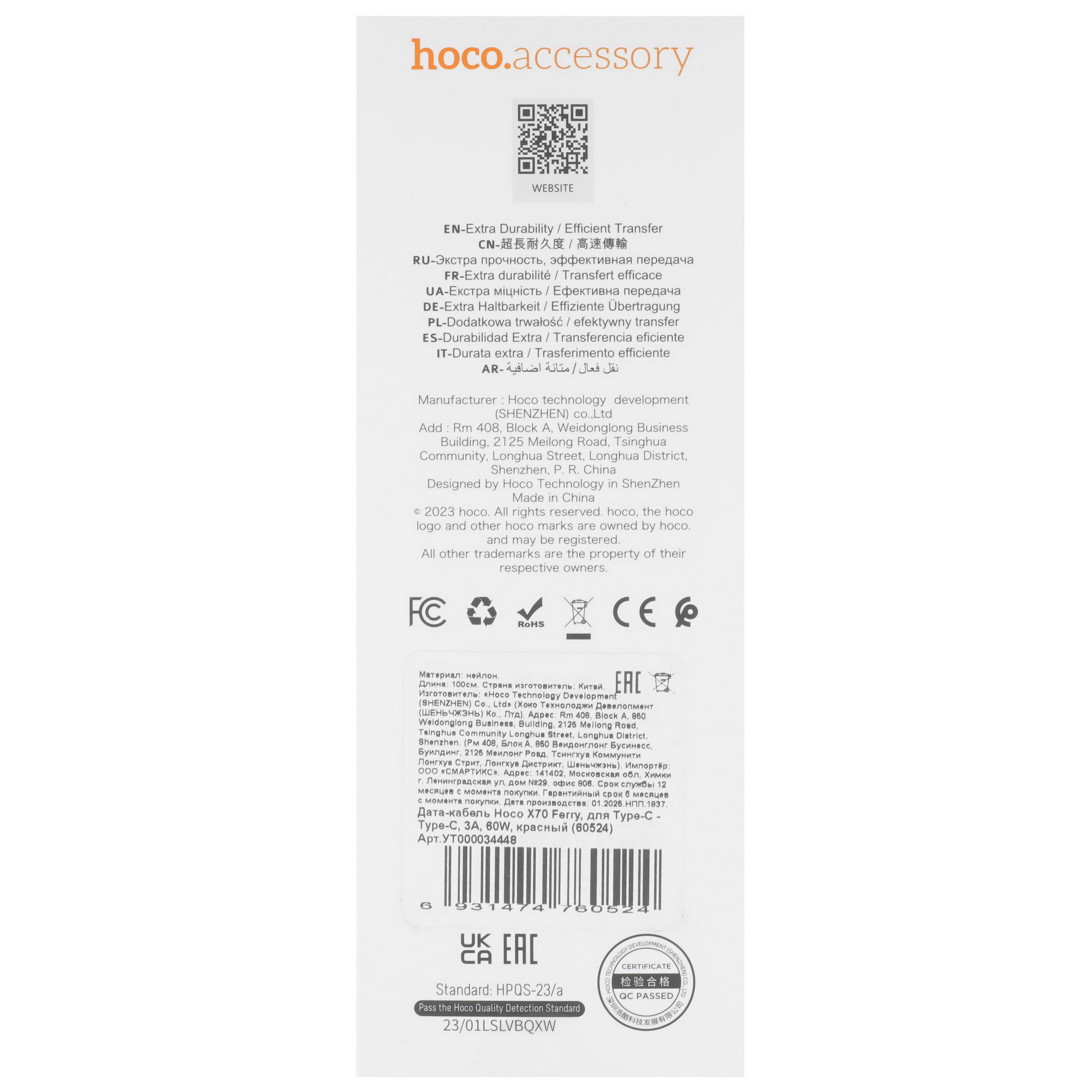 Защиту кабеля круглого Hoco USB Type-C - USB Type-C от механических воздействий обеспечивает оплетка из нейлона. Длина изделия – 1 м.