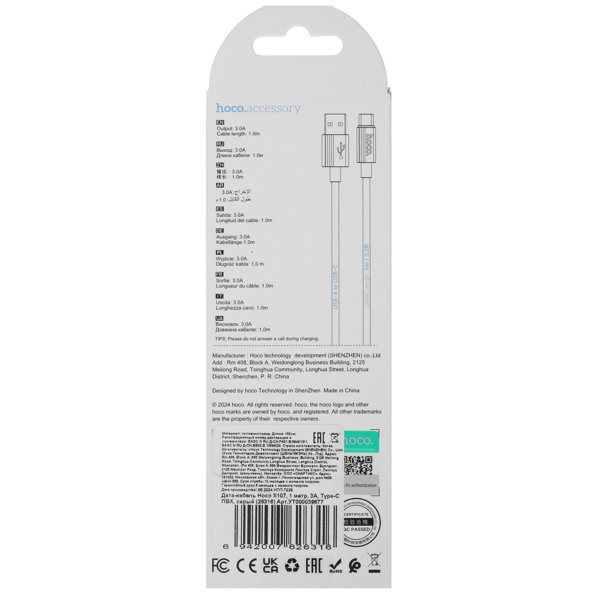 Кабель круглый Hoco USB Type-C - USB 2.0 Type-A серого цвета имеет длину 1 м. ПВХ оплетка защищает провод от повреждений и увеличивает срок службы. Hoco USB Type-C - USB 2.0 Type-A имеет скорость передачи данных до 480 Мбит/сек, благодаря которой можно скачать кино в Full HD качестве за 1.5 - 2 мин.