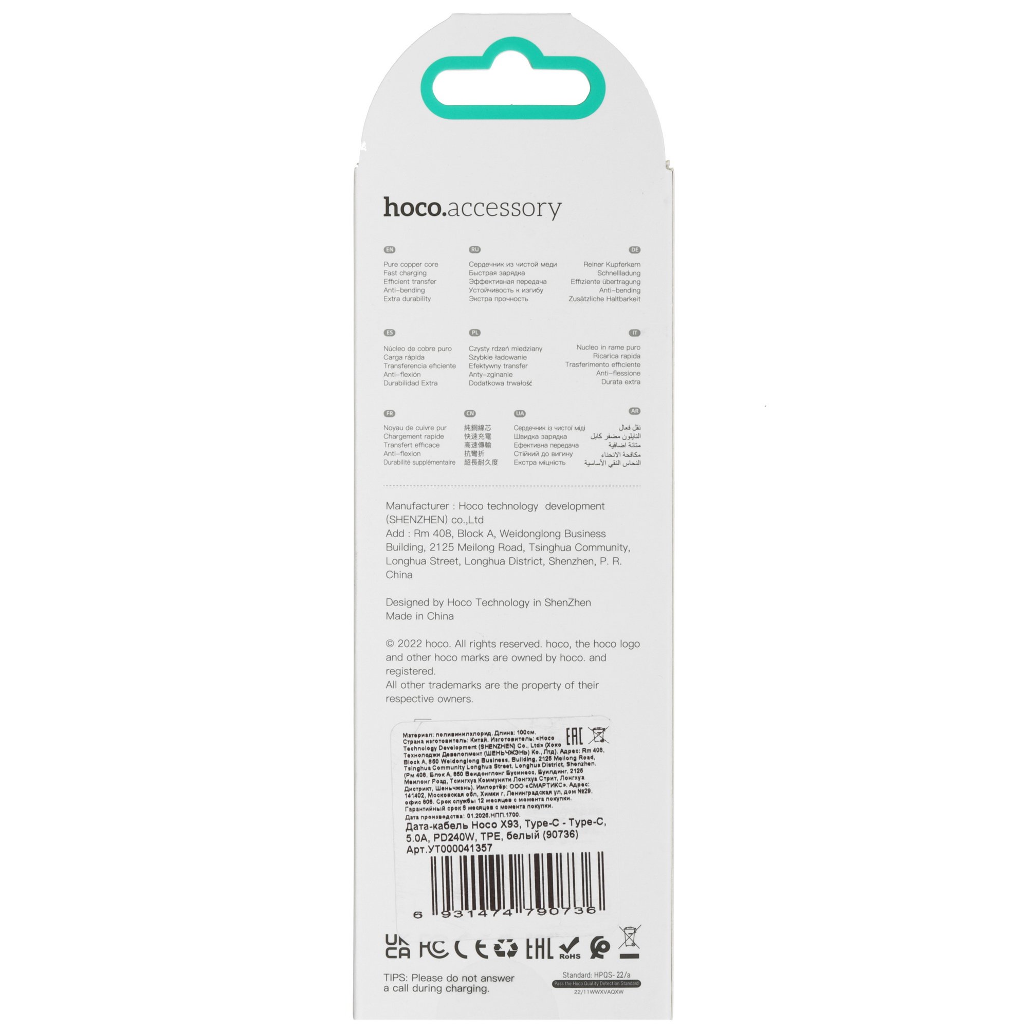 Экстра прочный кабель быстрой зарядки X93 от известного бренда Hoco. Эффективная и надежная передача данных. Шнур для зарядки Тайп Си с плотной оплеткой в диаметре 6 мм, что делает его устойчивым к изгибам и заломам. Зарядка для телефона, планшета, наушников, колонок, ноутбуков и наушников будет всегда под рукой, где бы вы не находились дома, в офисе или в путешествии. Зарядный кабель имеет длину 1 метр.