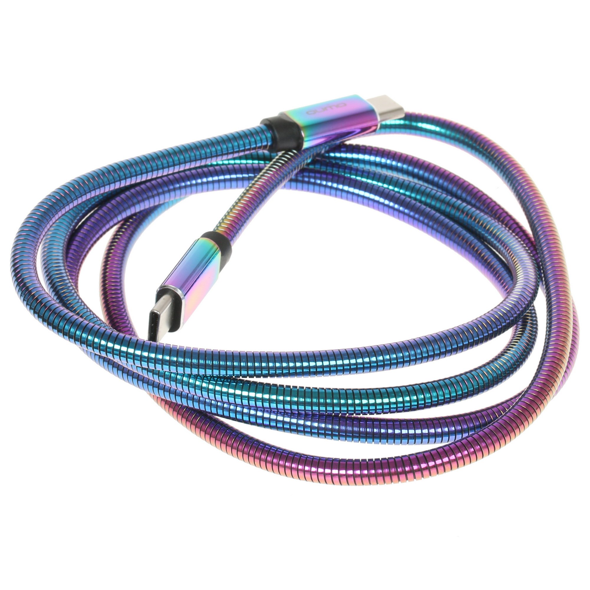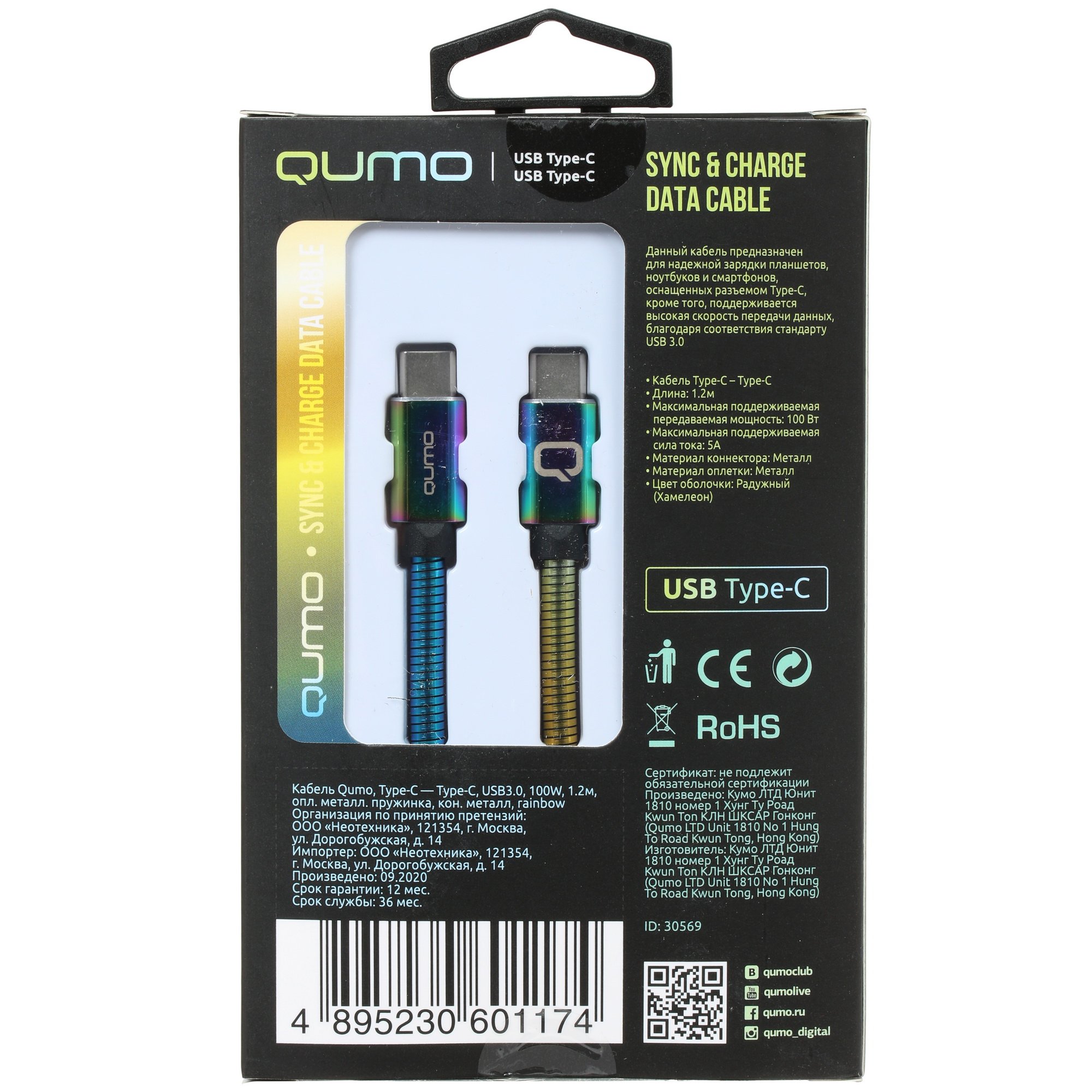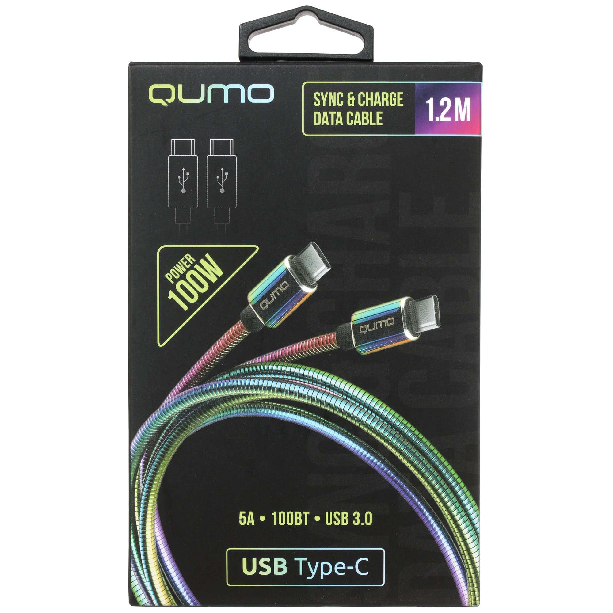 Кабель Qumo, Type С - Type C, USB 3.0, 1,2м, 5-20В, 5А, 100 Вт, опл. металл. пружинка, кон. металл, rainbow