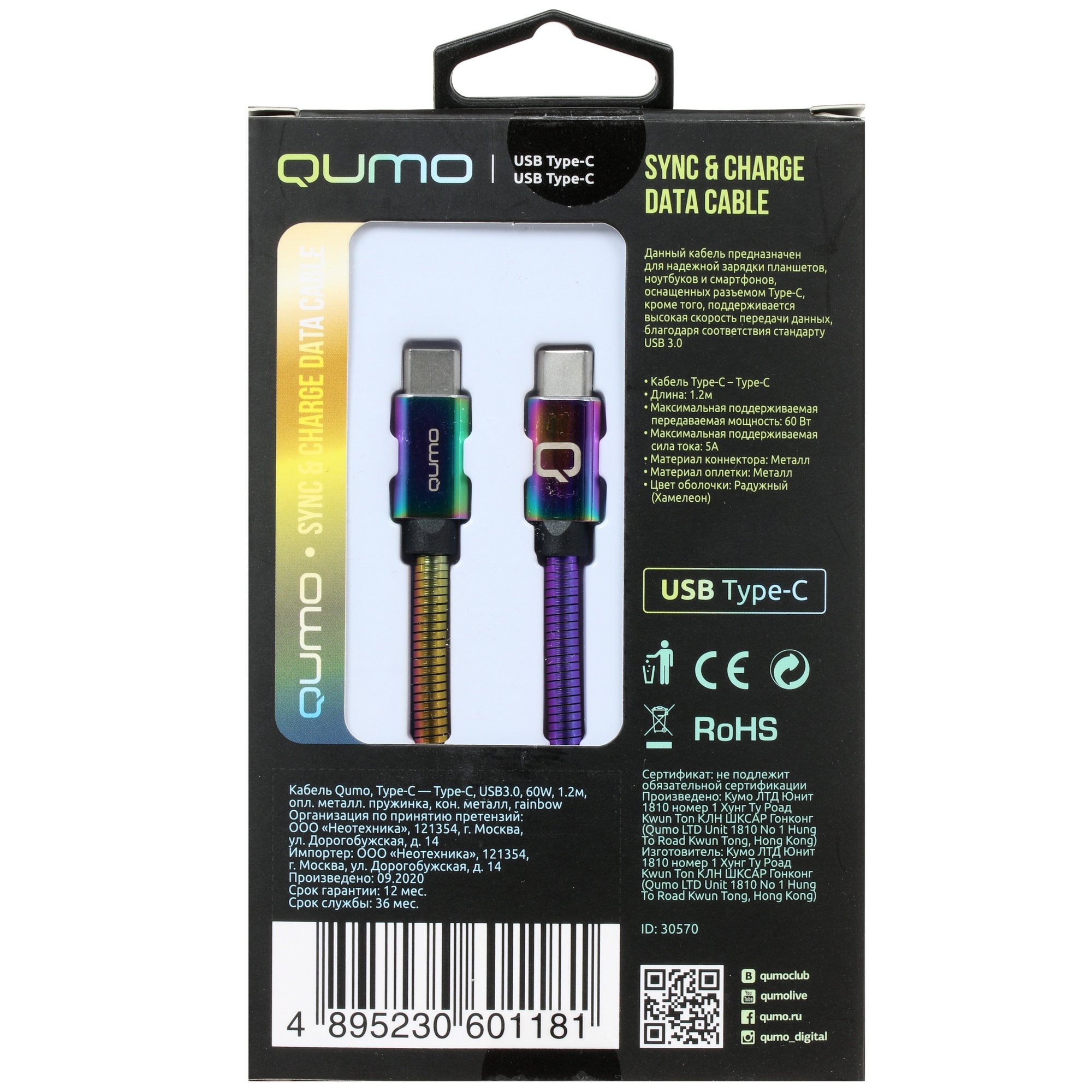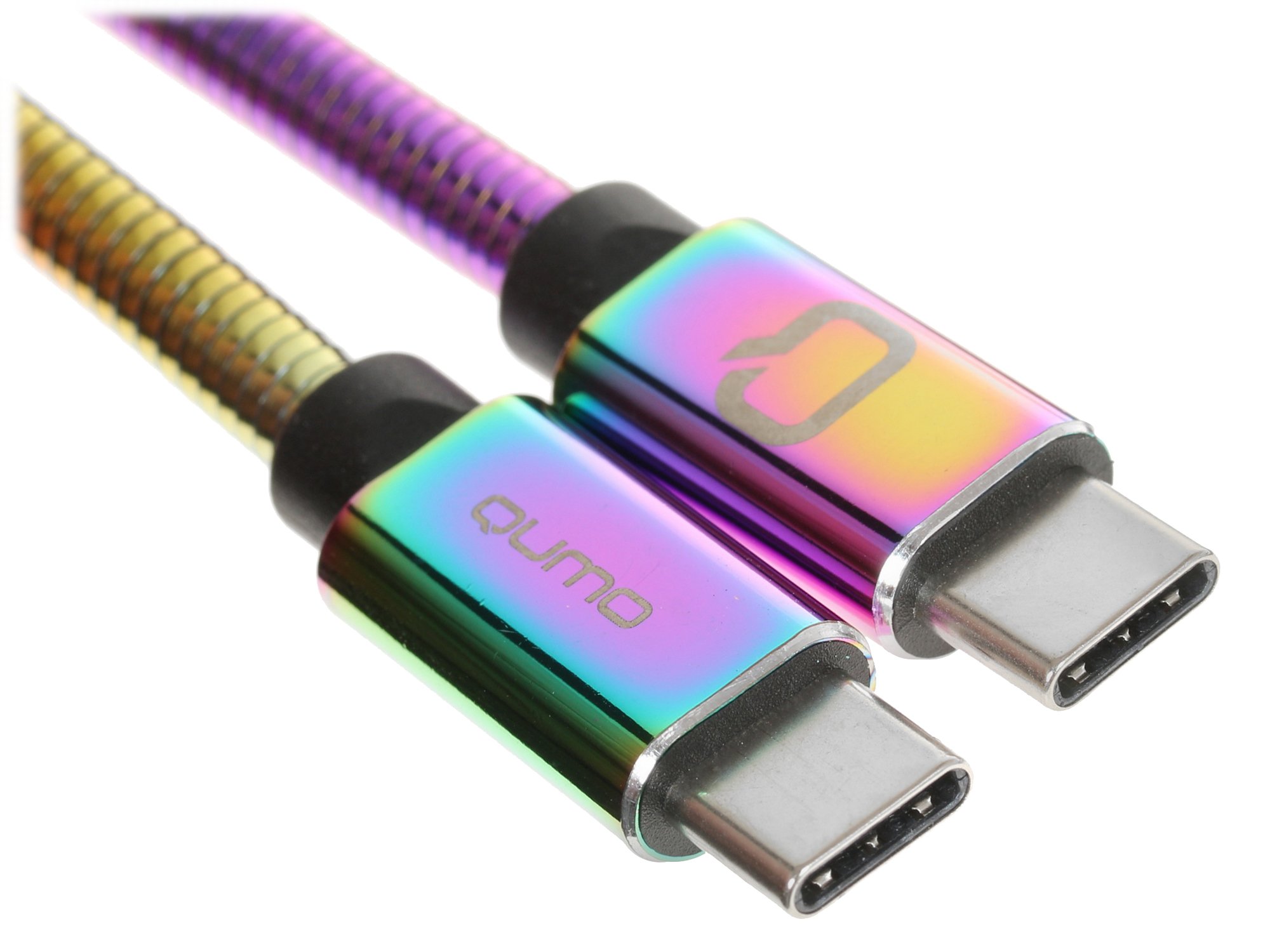 Кабель Qumo, Type С - Type C, USB 3.0, 1,2м, 5-20В, 5А, 60 Вт, опл. металл. пружинка, кон. металл, rainbow
