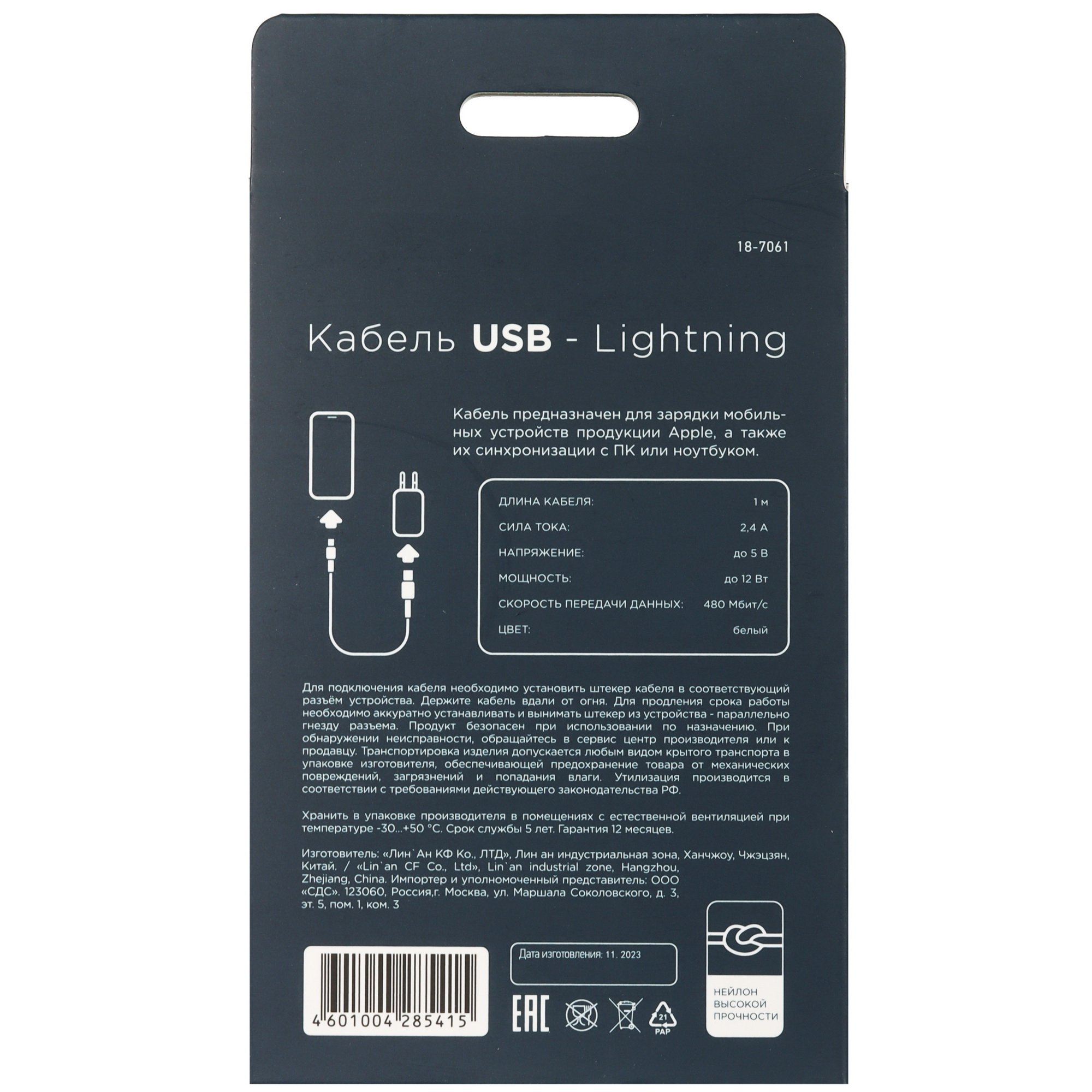 Кабель круглый REXANT Lightning 8-pin - USB Type-C поддерживает скорость обмена информацией до 480 Мбит/с. Изделие пропускает ток до 2.4 А. Длина кабеля составляет 1 м.