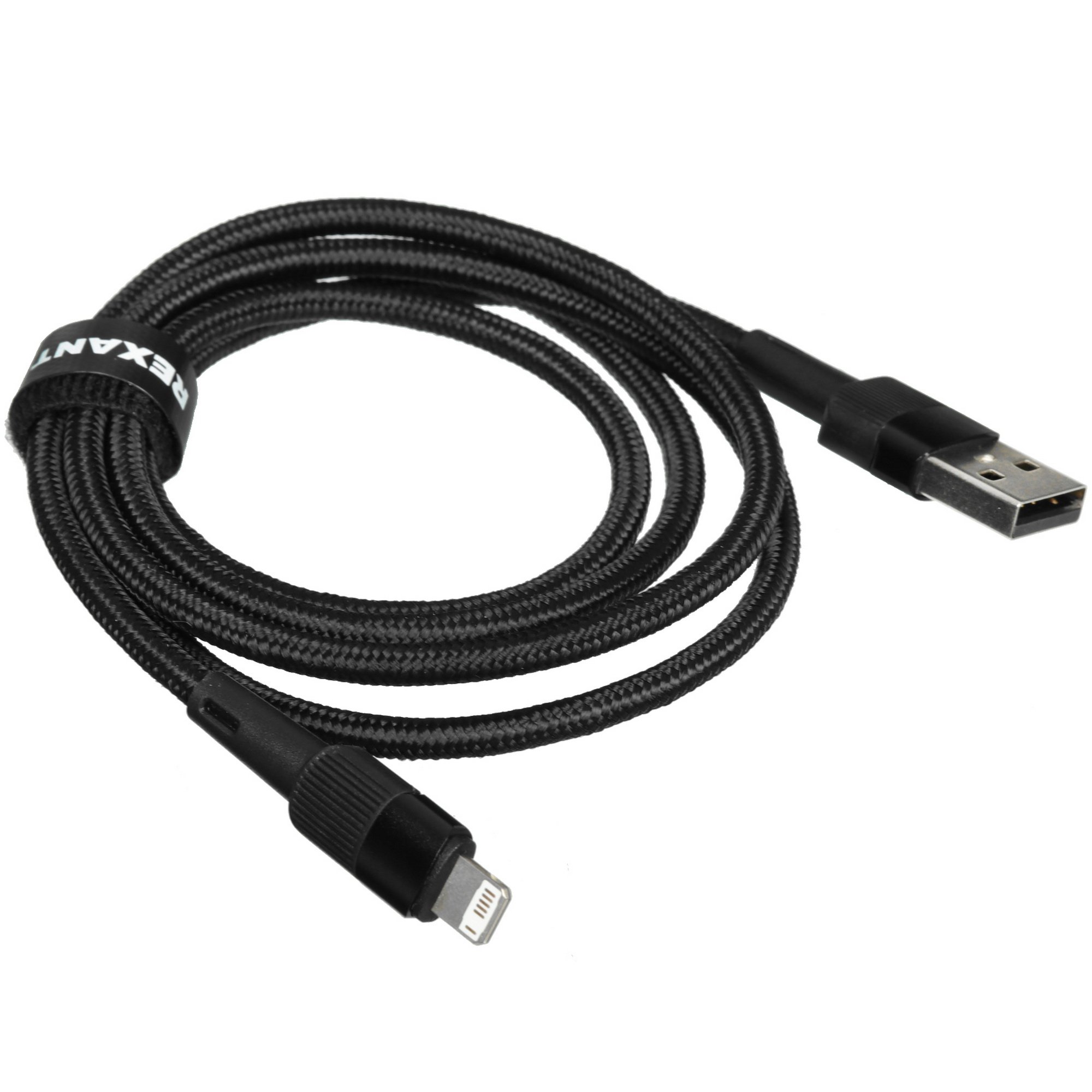 Кабель Rexant USB-A - Lightning для Apple, 2,4А, 1м, в черной нейлоновой оплетке
