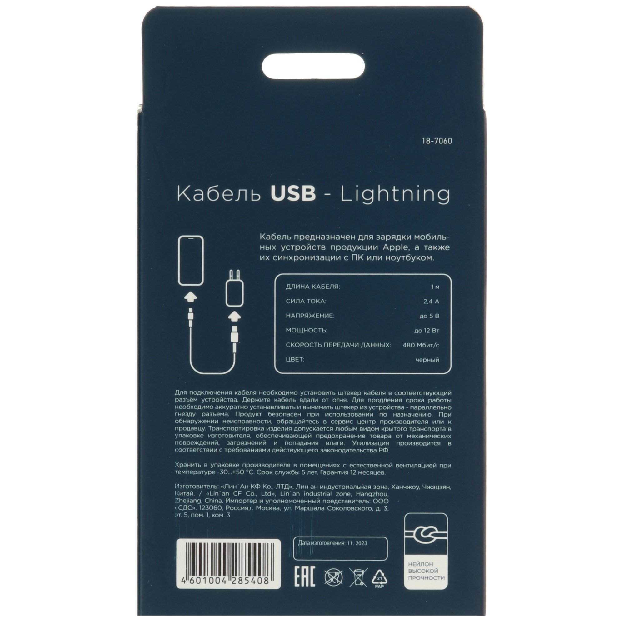 Кабель круглый REXANT Lightning 8-pin - USB Type-A поддерживает скорость обмена информацией до 480 Мбит/с. Изделие пропускает ток до 2.4 А. Длина кабеля составляет 1 м.