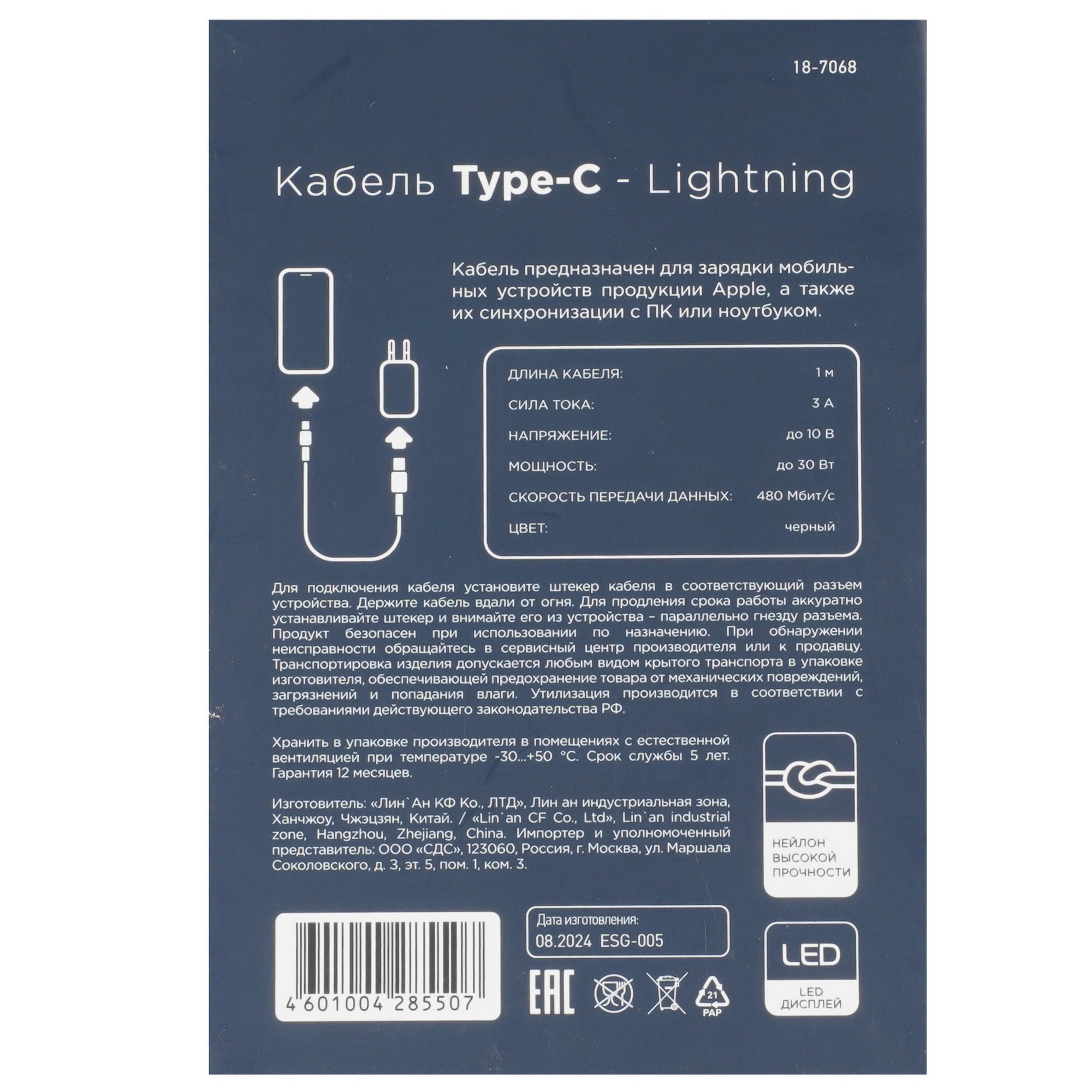 Кабель предназначен для зарядки электронных устройств продукции Apple, а также их синхронизации с ПК или ноутбуками. С одной стороны изделия расположен разъем USB-С, а с другой – разъем Lightning.