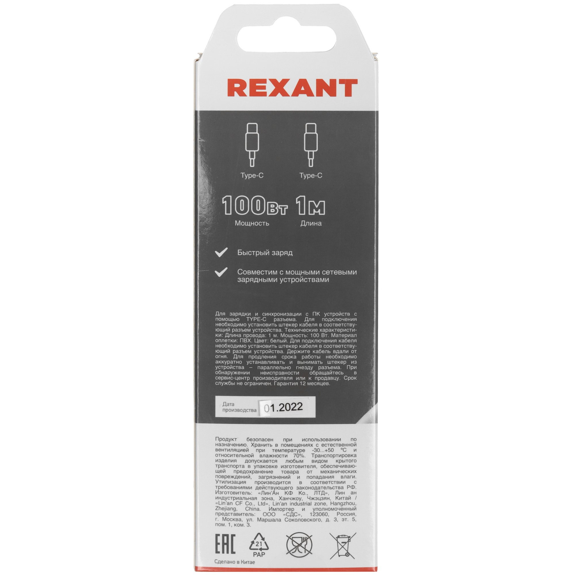 Кабель круглый REXANT USB Type-C - USB Type-C белого цвета имеет длину 1 метр, мощность 100 Ватт, напряжение 5 Вольт и ток 3 Ампера. ПВХ оплетка защищает кабель REXANT USB Type-C - USB Type-C от повреждений и увеличивает срок службы. Устройство поддерживает технологию быстрой зарядки Power Delivery.