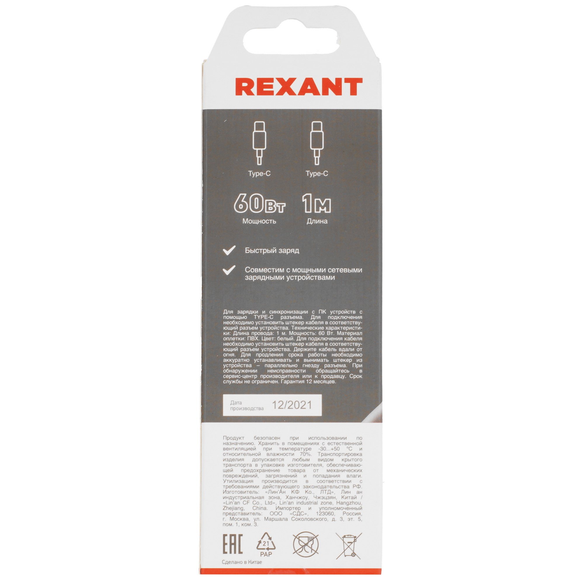 Кабель Rexant Type-C - Type-C PD 60W/1m/PVC/белый
