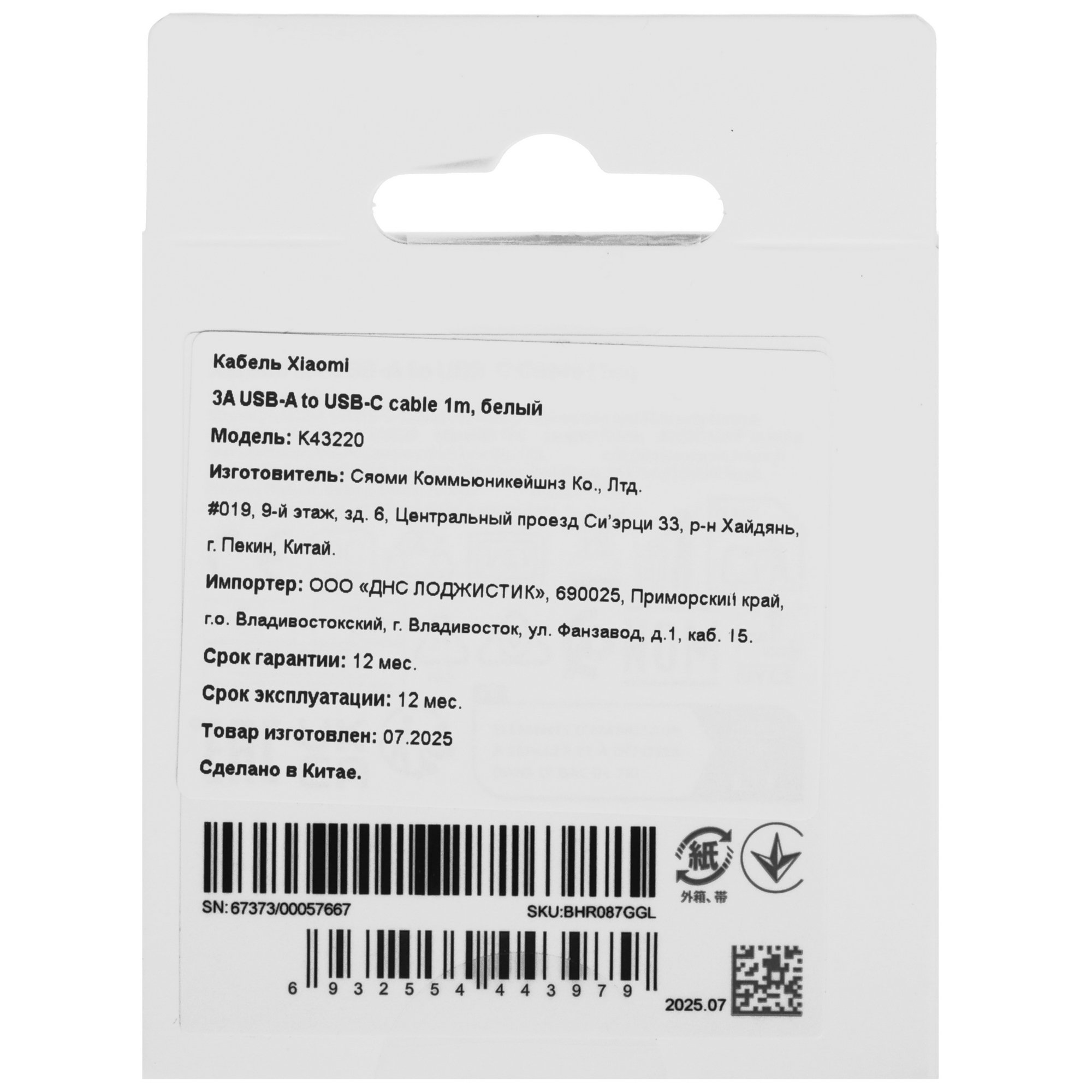 Кабель Xiaomi 3A USB-A to USB-C Cable 1m белый