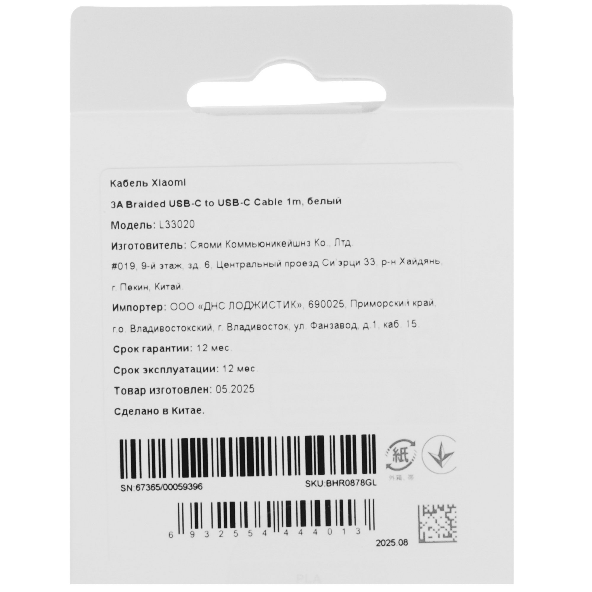 Кабель Xiaomi 3A Braided USB-C to USB-C Cable 1m белый