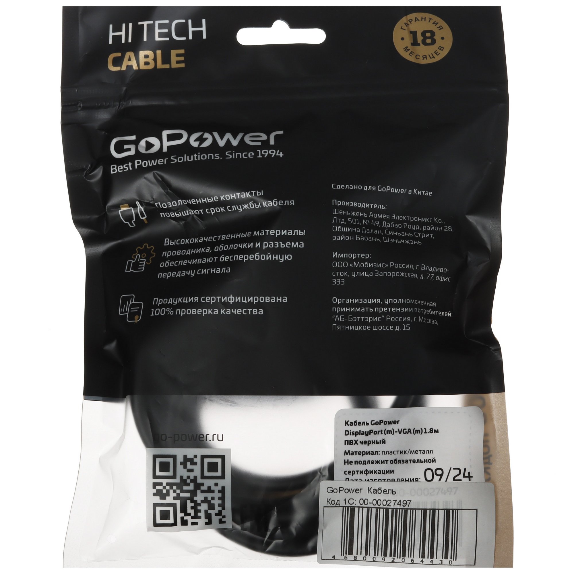 Кабель GoPower DISPLAYPORT-VGA 1.8M 00-00027497 черный