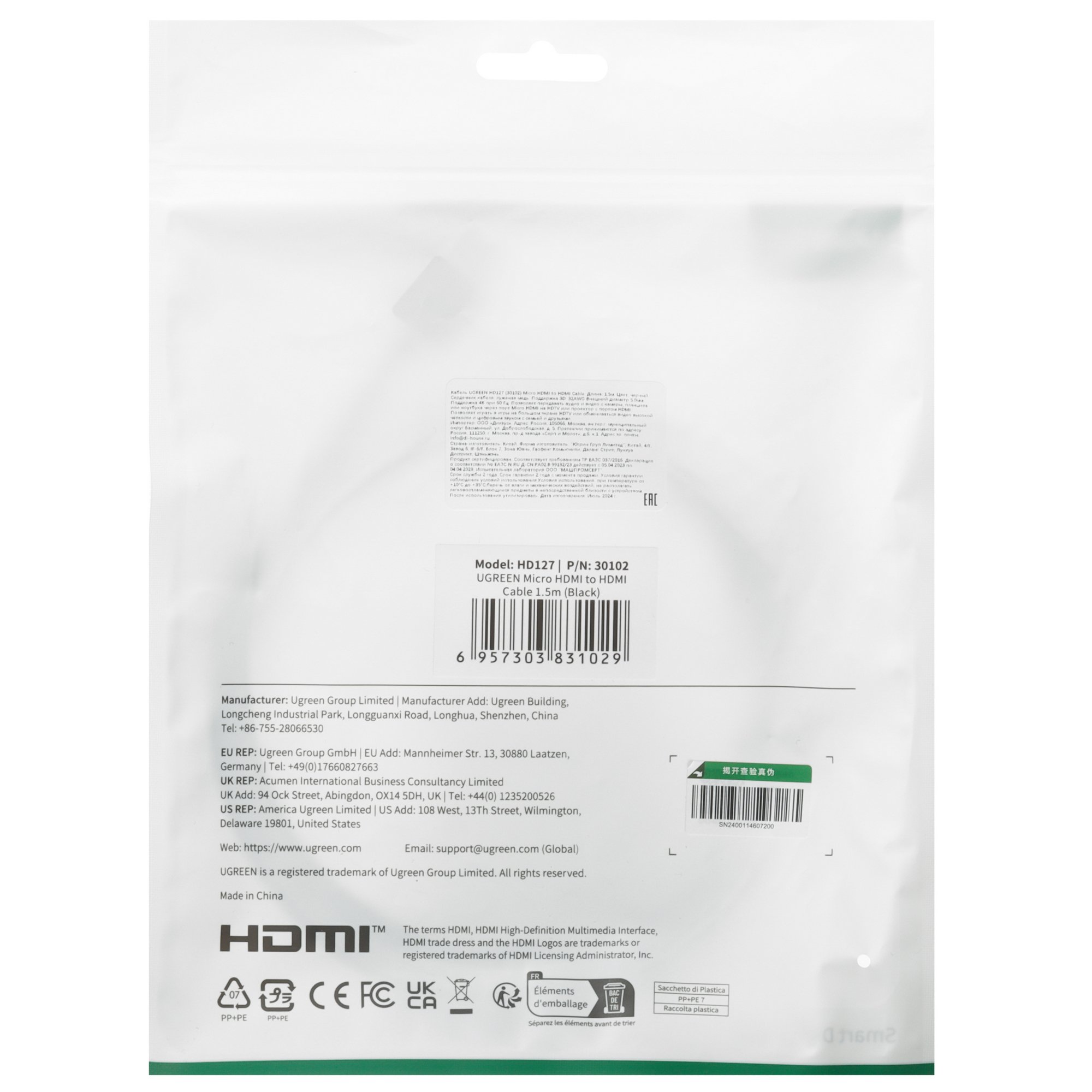 Кабель однонаправленный Ugreen HDMI - micro HDMI обладает длиной 1.5 м. Формат передаваемого сигнала – цифровой. Кабель поддерживает статический HDR.