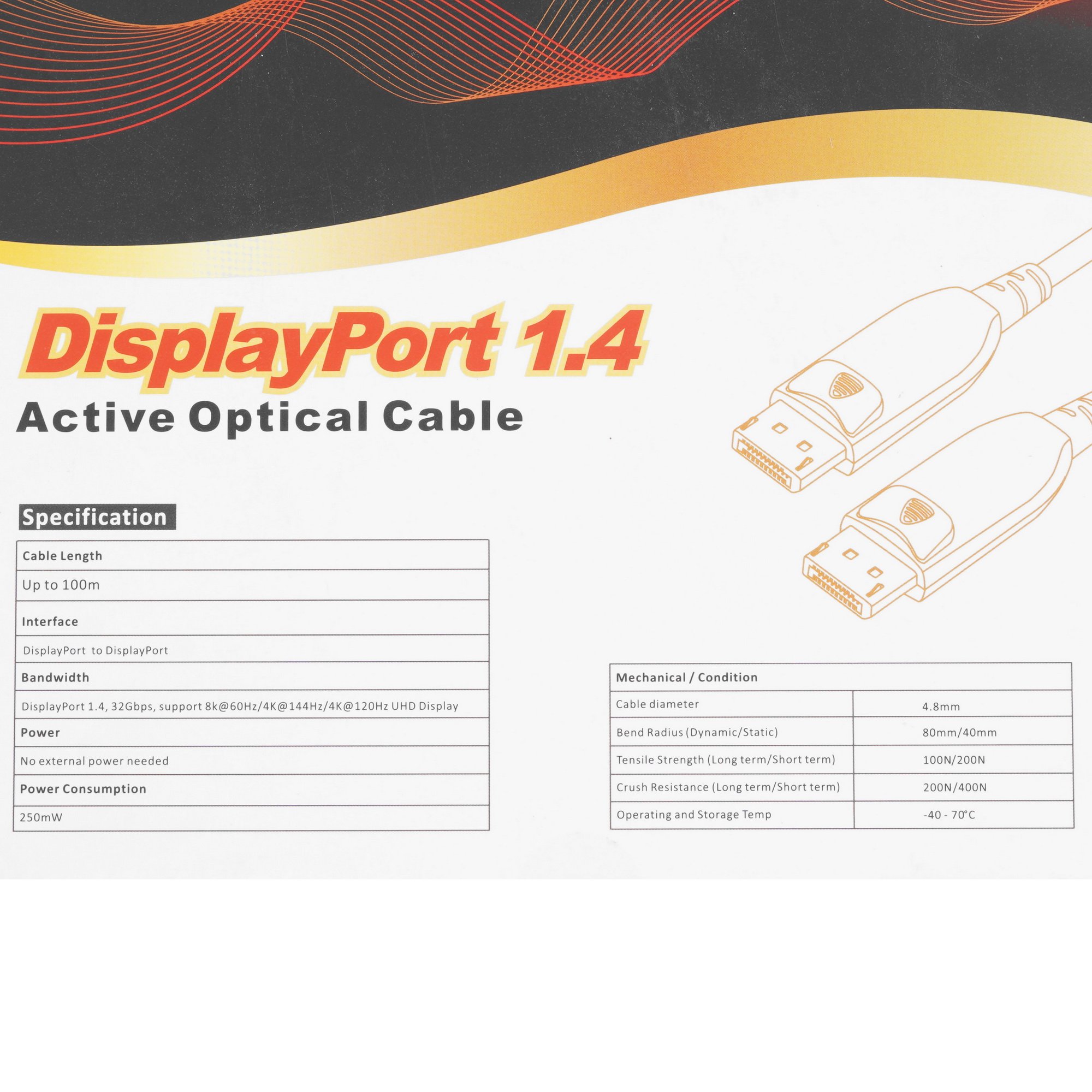 Активный оптический кабель VCOM DisplayPort - DisplayPort, 30 м в черном цвете служит для соединения устройств с разъемом DisplayPort к устройствам c DisplayPort разъемом. Длина кабеля 30 метров позволяет разместить устройства на необходимом расстоянии друг от друга. Версия 1.4 гарантирует поддержку разрешения 7680x4320 и частоту обновления 60 Гц. Цифровой однонаправленный сигнал используется для передачи информации от одного устройства к другому. Пропускная способность кабеля VCOM DisplayPort - DisplayPort, 30 м составляет 32 Гб/сек и позволяет смотреть фильм в формате 8К без задержки и потери качества. Кабель предназначен для соединения мониторов, проекторов, телевизоров и других устройств с поддержкой DisplayPort.