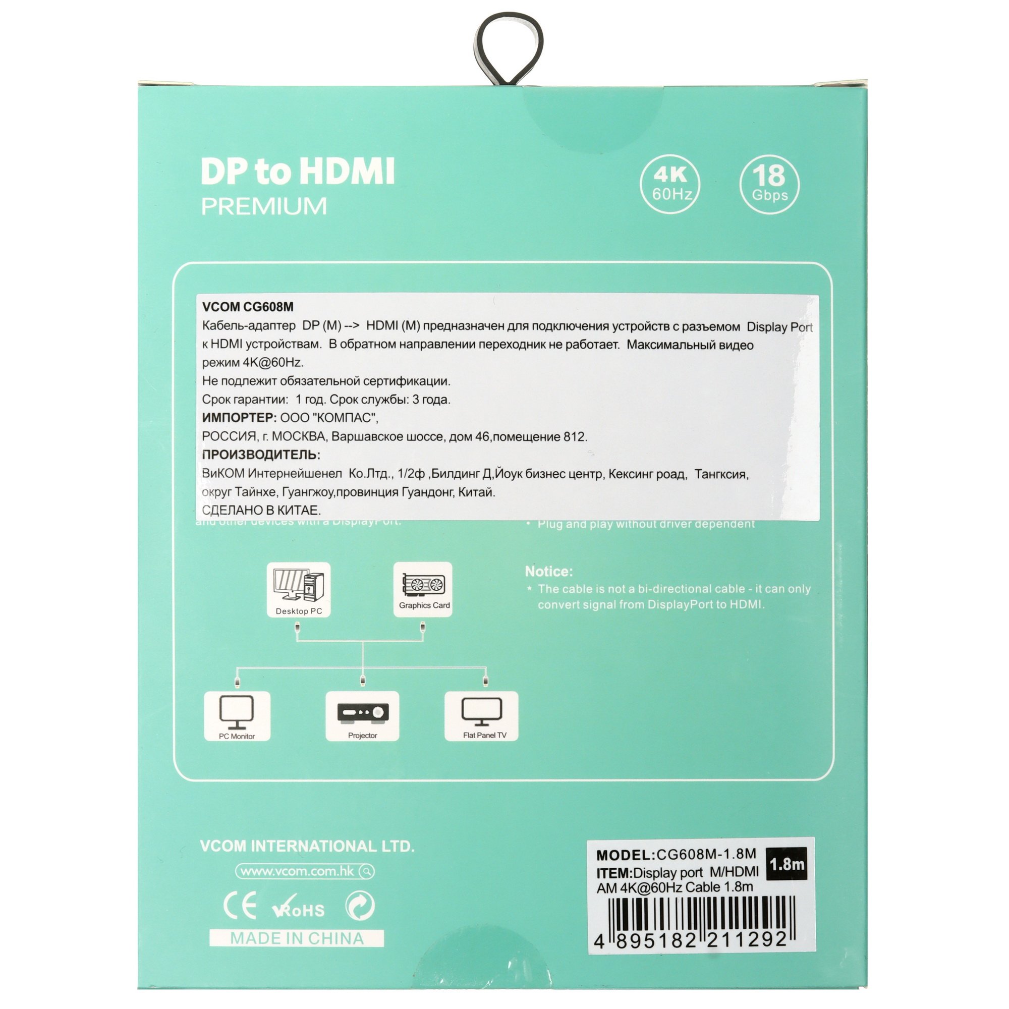 Кабель-переходник VCOM CG608M-1.8M DisplayPort M-> HDMI M 4K@60Hz 1,5 м VCOM (CG608M-1.8M)