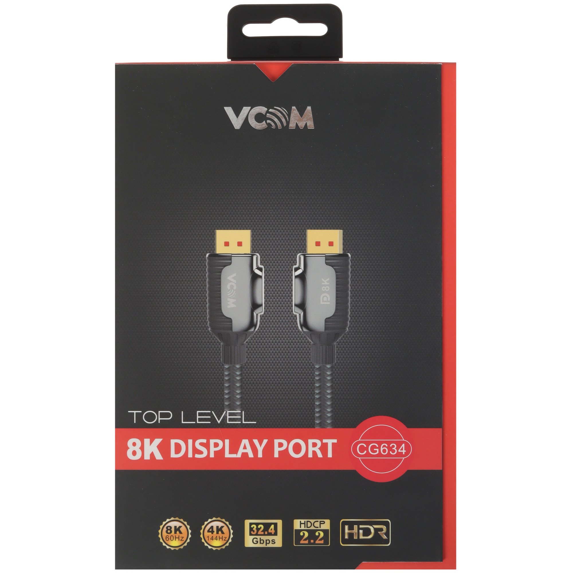 Двунаправленный кабель VCOM DisplayPort - DisplayPort используется при передаче цифрового видеосигнала со звуком. Разрешение видео ограничено 7680x4320. Максимальная частота кадров при высшей детализации изображения составляет 60 Гц. Кабель соответствует версии DP 1.4 и поддерживает CEC, EDID, HBR3, HDCP 2.2 и HDR. Пропускная способность аксессуара – 32.4 Гбит/с. Длина кабеля VCOM DisplayPort - DisplayPort – 1.5 м.