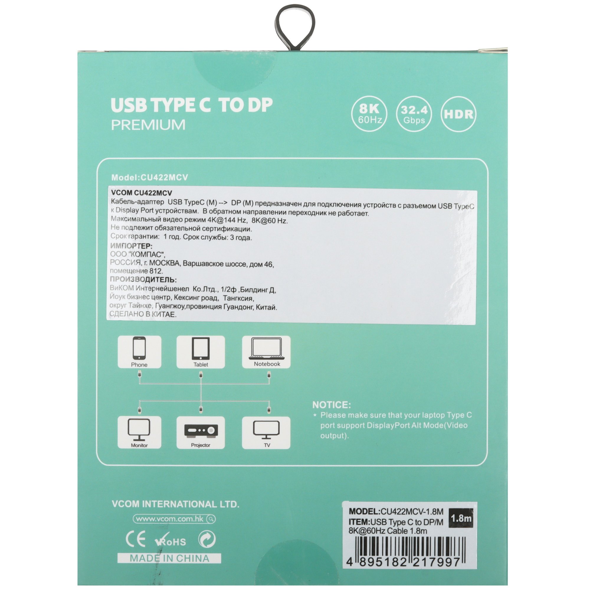 Кабель однонаправленный VCOM USB Type-C - DisplayPort, 1.8 м обеспечивает передачу цифрового видеосигнала со звуком от воспроизводящего источника к ТВ или монитору. Однонаправленный кабель обеспечивает передачу изображения в разрешении до 7680x4320. Соединительный аксессуар с проводниками из меди работает только в одном направлении, передавая сигнал только от источника к устройству вывода.