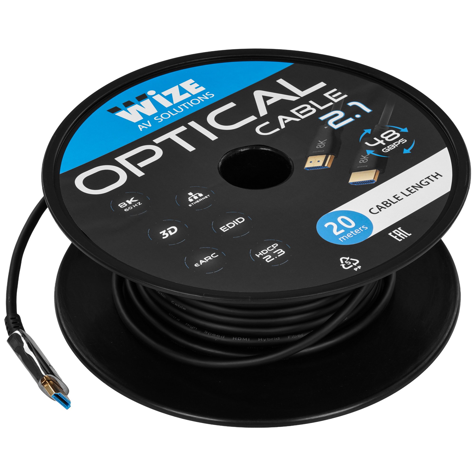 Кабель HDMI Wize AOC-8K-HM-HM-20M оптический, 20 м, 8K/60HZ 4:4:4, v.2.1, ARC, 19M/19M, HDCP 2.2, Ethernet, черный, коробка