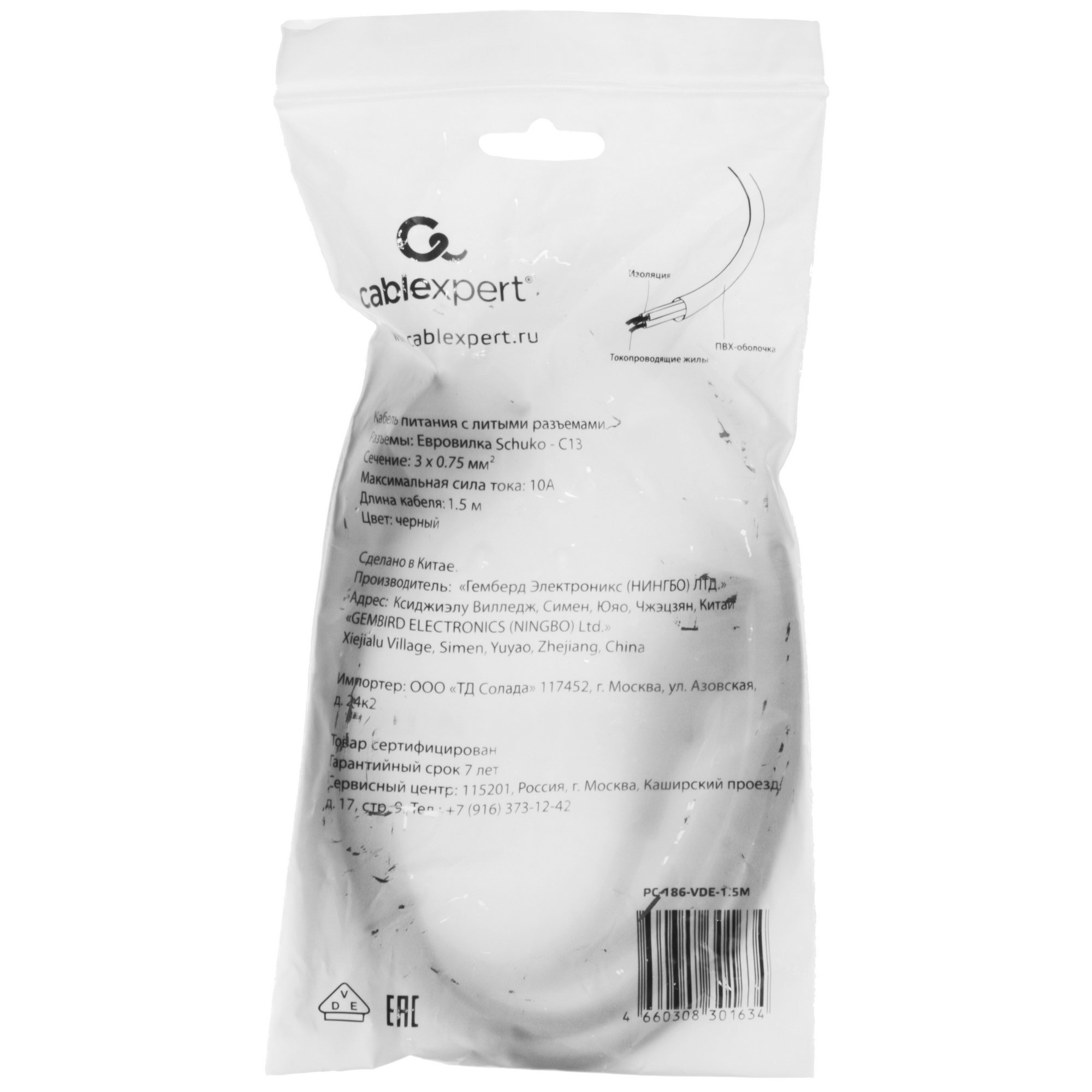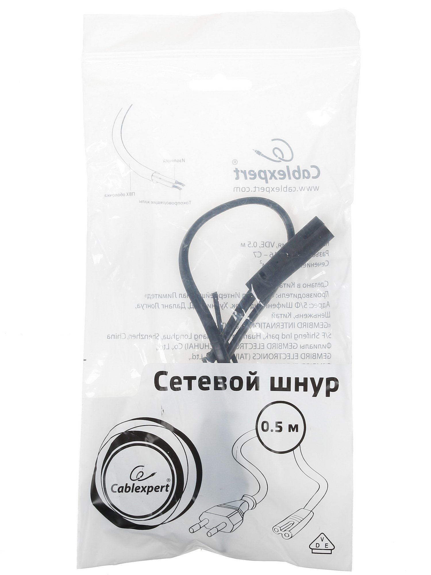 Кабель питания Cablexpert аудио/видео 0,5м, CEE 7/16 - C7, VDE, 2-pin, 2х0,75, черный, пакет (PC-184-VDE-0.5M)