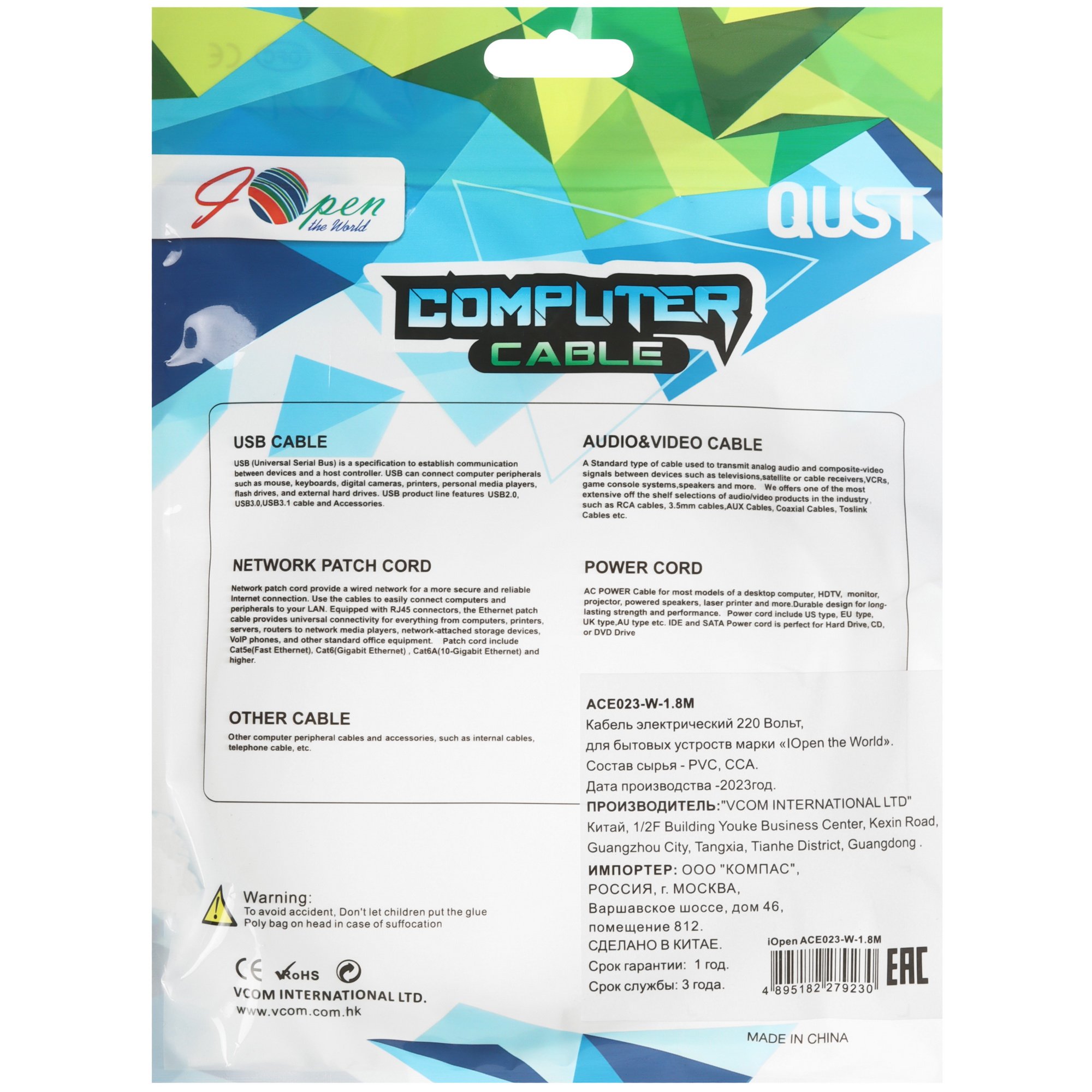 Кабель питания iOpen имеет длину, составляющую 1.8 м. Как правило, такая длина кабеля достаточна для комфортного размещения оборудования. Цвет изделия – белый. Кабель питания рассчитан на длительный срок эксплуатации.