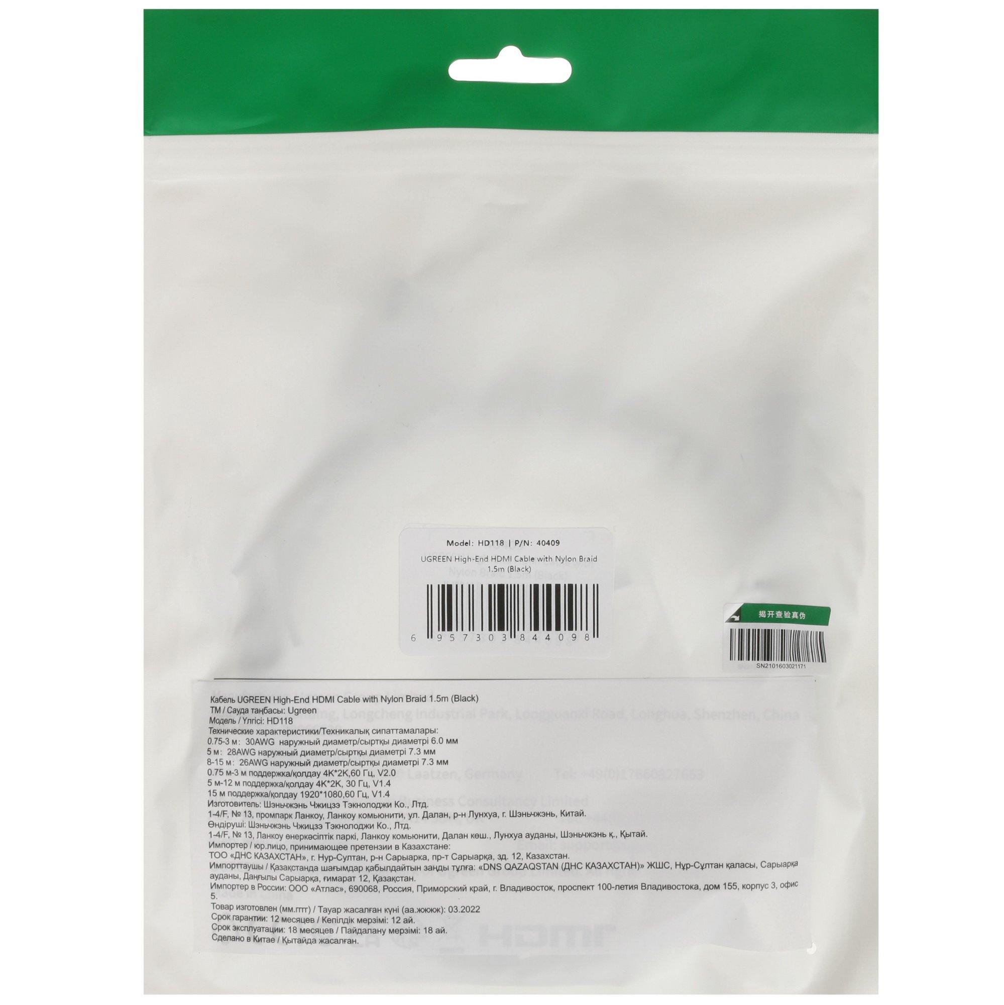 Кабель соединительный Ugreen HDMI - HDMI применяется в случае необходимости двустороннего обмена данными между двумя совместимыми устройствами. Он подходит для подключения к компьютеру, телевизору, проектору, игровой консоли и другой технике с интерфейсом HDMI. Благодаря позолоченным разъемам достигается стабильная передача сигнала без искажений. Данный кабель поддерживает двунаправленный поток сигнала с разрешением до 4K и пропускной способностью в пределах 18 Гбит/с. Для защиты внутренних проводов используется тканевая оплетка. Длина кабеля составляет 1.5 метра.