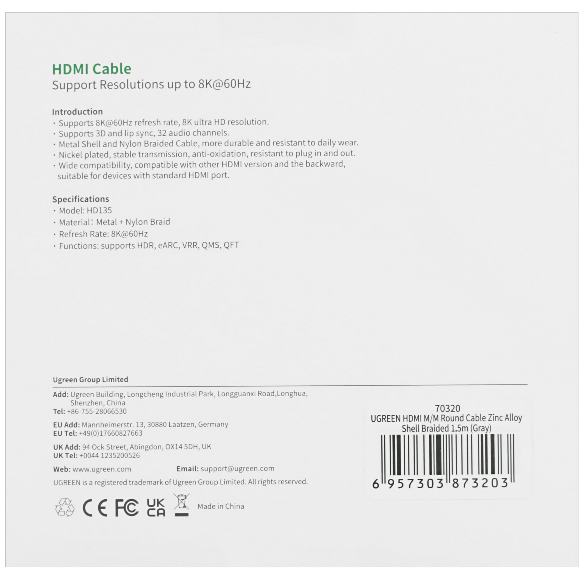 Кабель соединительный Ugreen HDMI - HDMI предназначен для передачи цифрового видеосигнала между совместимым оборудованием и оснащен интерфейсными разъемами HDMI версии 2.1 с обеих сторон. Никелированные разъемы обеспечивают стабильность сигнала. Данный кабель поддерживает двунаправленный поток сигнала с разрешением до 8K и отличается пропускной способностью в пределах 48 Гбит/с. Для защиты внутренних проводов кабеля Ugreen применяется износостойкая тканевая оплетка. Одним из преимуществ кабеля является длина 1.5 метра.