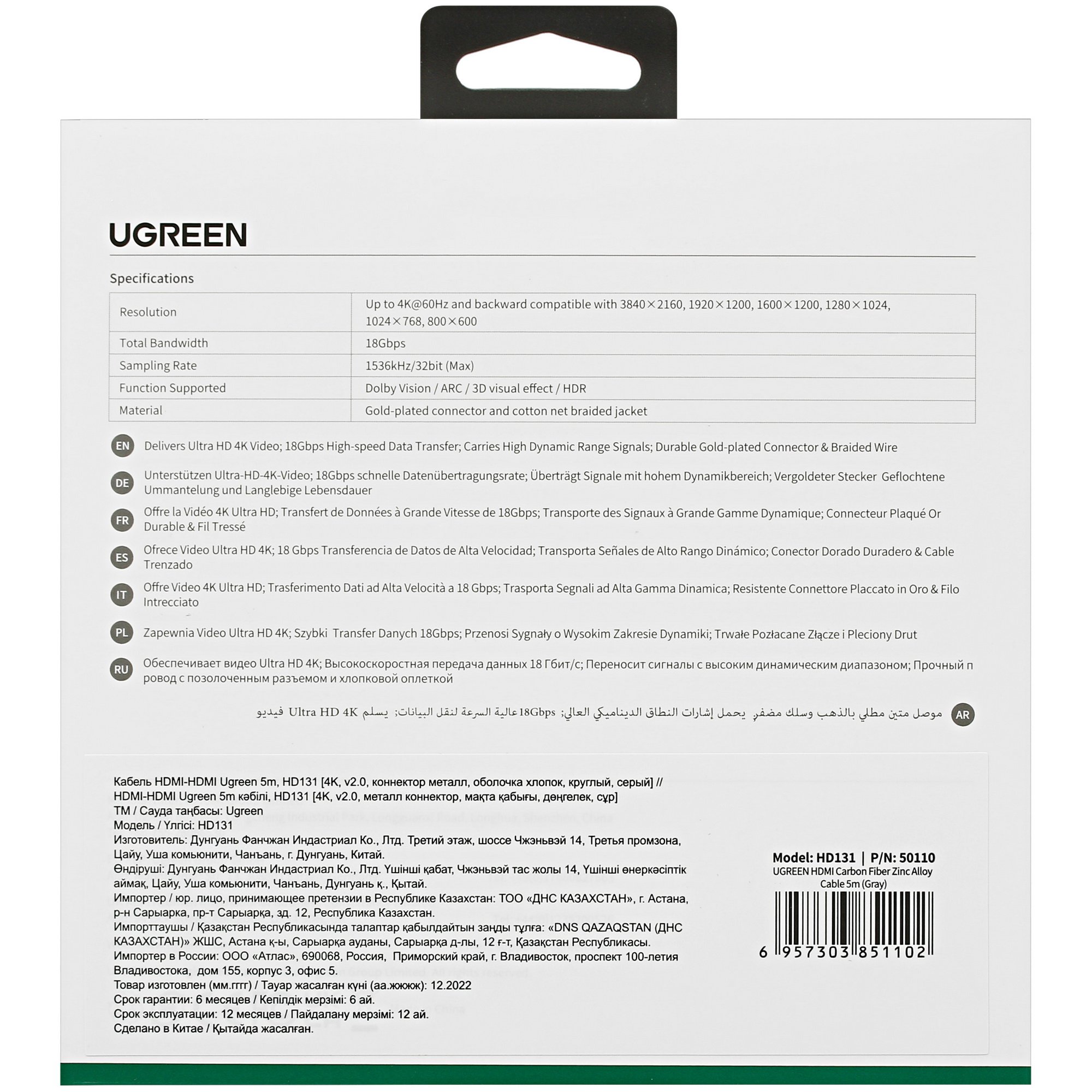 5-метровый кабель соединительный Ugreen HDMI - HDMI гарантирует удобство подключения оборудования на значительном расстоянии. Назначение изделия – передача цифрового видеосигнала со звуком. Максимально поддерживаемое разрешение видео – 3840x2160. Предельная частота кадров при такой детализации видео равна 60 Гц.