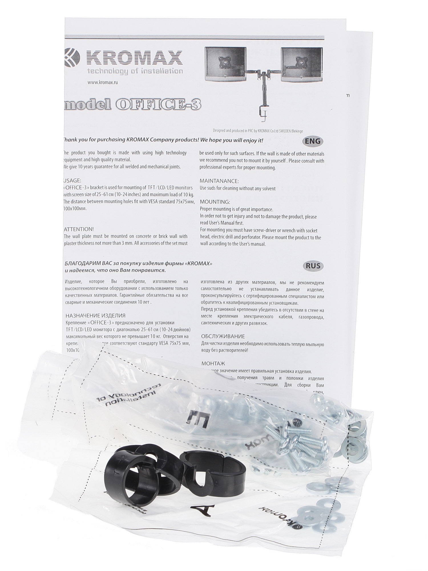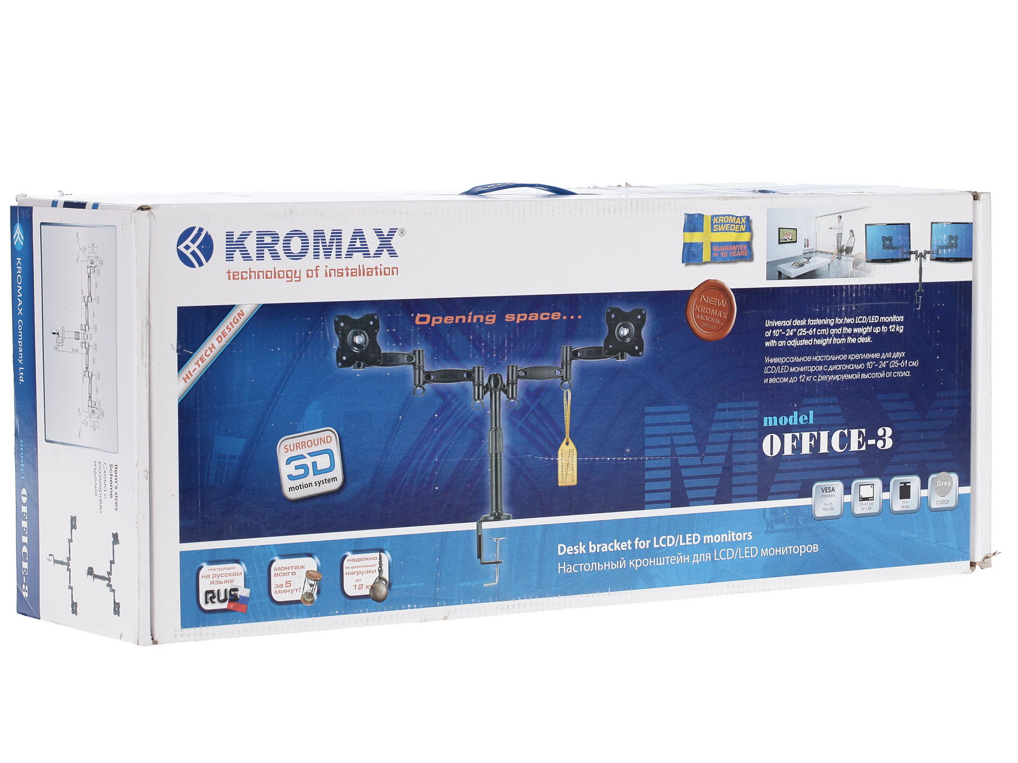 Крепление для мониторов Kromax Office-3 имеет эргономичную конструкцию, которая позволяет надежно зафиксировать в подвешенном состоянии монитор, чей вес не более 12 кг. Представленный прибор разработан и произведен именитой компанией Kromax, которая давно осуществляет производство высокотехнологичных аксессуаров для компьютеров.