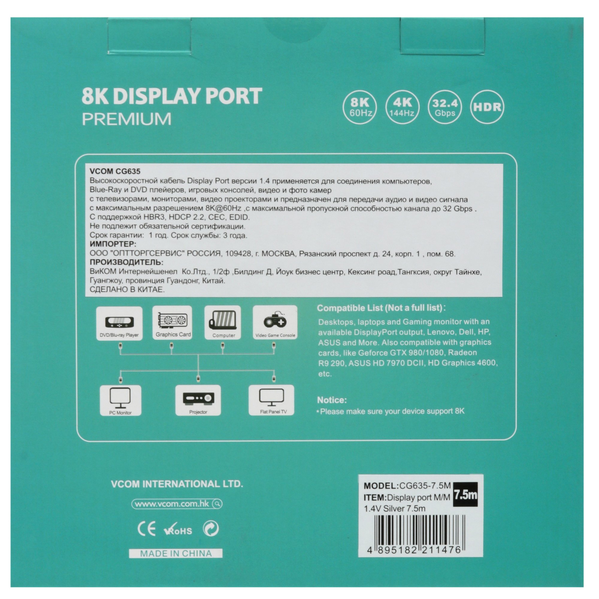 Кабель соединительный DISPLAY PORT v1.4, 8K@60Hz, 7.5m, медь, VCOM CG635-7.5M