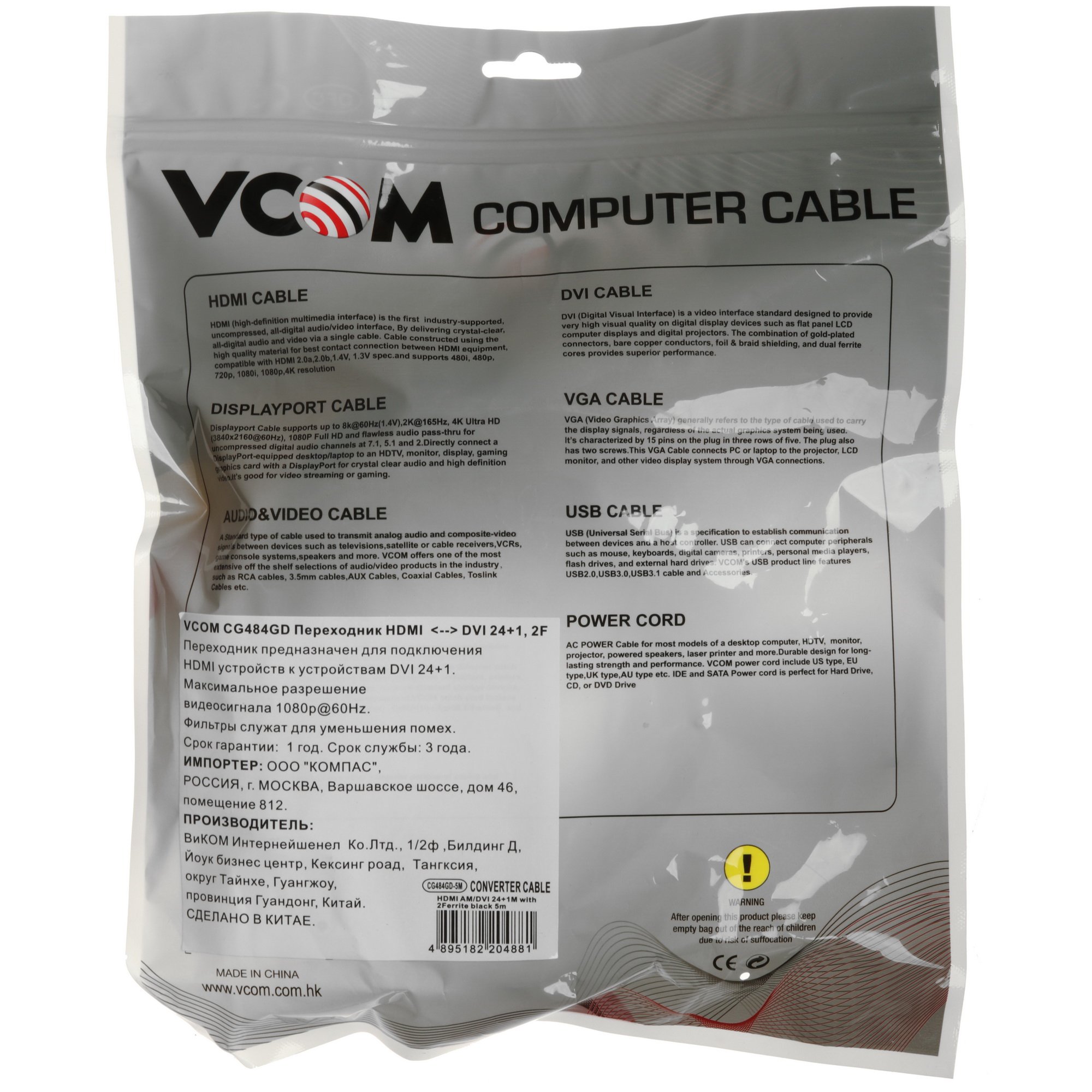 Кабель HDMI AM/DVI(24+1)M, 5м, CU, 1080P@60Hz, 2F, VCOM <CG484GD-5M>