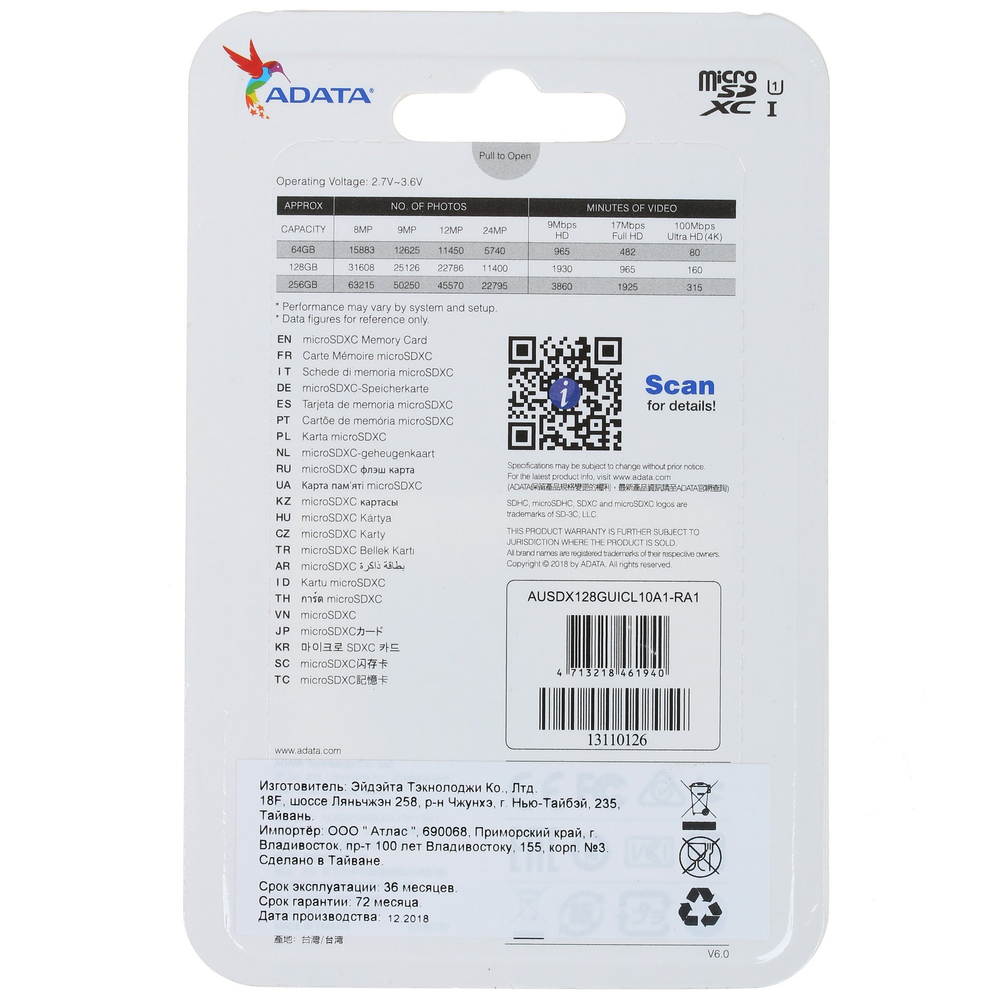 Карта памяти ADATA microSDXC 128 ГБ AUSDX128GUICL10A1-RA1 укомплектована адаптером, с помощью которого носитель данных можно устанавливать в оборудование, которое рассчитано на использование карт памяти SD. Применение адаптера часто требуется в случае использования карт-ридера. В качестве упаковки карты памяти был использован блистер традиционной конструкции, дизайн которого узнаваем: перед вами продукция ADATA.