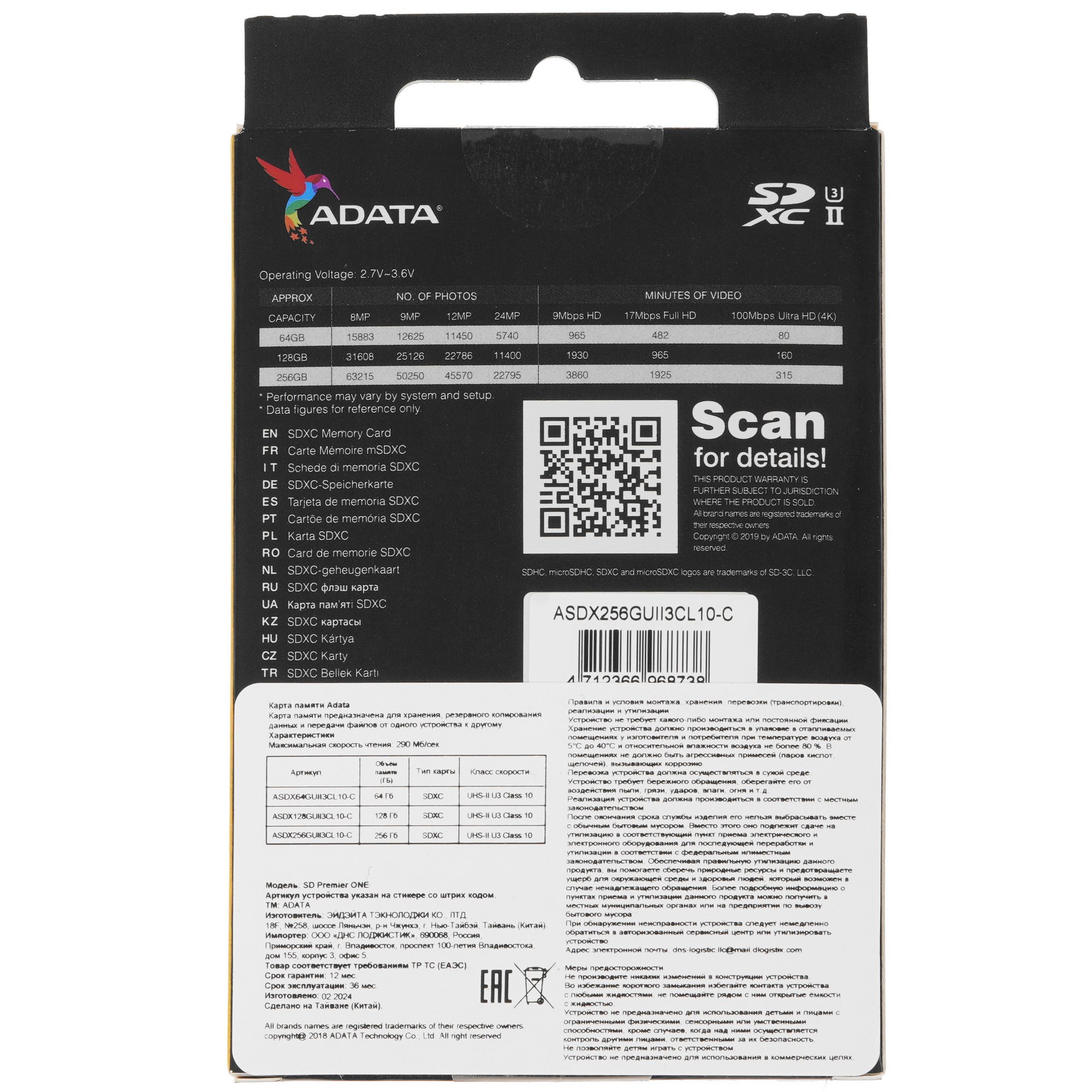 Карта памяти ADATA Premier One – накопитель данных с типоразмером SDXC и встроенной памятью 256 ГБ. Модель принадлежит к классам скорости Class 10, UHS Class 3 и Video Class 90, которые позволят использовать ее в профессиональном фото- и видеооборудовании для съемки видео в разрешении до 8K при частоте 60-120 кадр./сек. Скорость записи данных на карту памяти Class 10, UHS Class 3, Video Class 90 может достигать 155 Мбайт/сек. Прочный корпус позволит использовать устройство в сложных условиях с температурой воздуха от -25 °C до 85 °C.