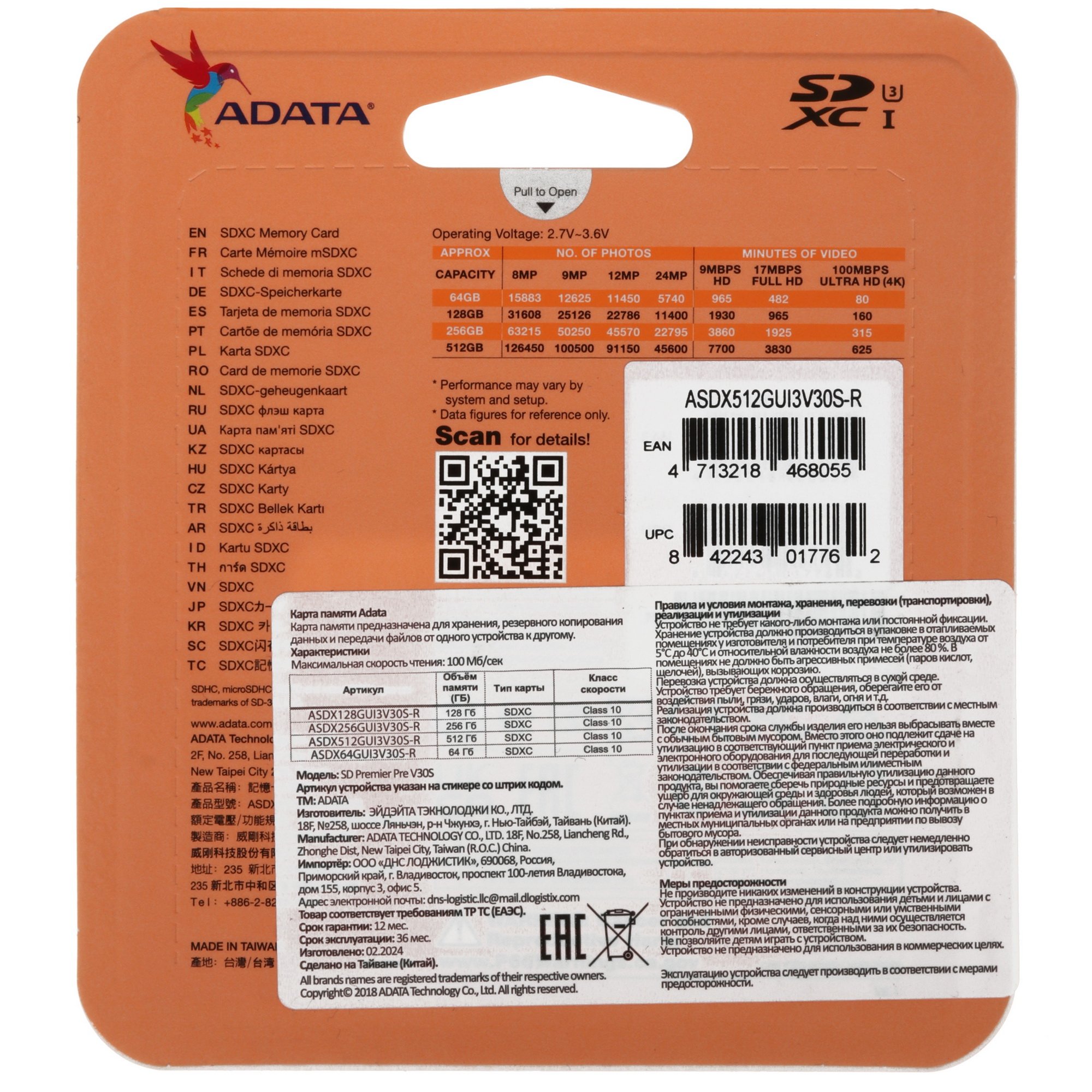 ADATA Premier Pro [ASDX512GUI3V30S-R] с классом Class 10 считывает данные со скоростью 100 Мбайт/сек, а записывает при 85 Мбайт/сек. Модель подходит для установки в устройства с поддержкой UHS-протокола. Маркировка Video Class 30 подтверждает скорость последовательной записи 30 МБ/сек.
