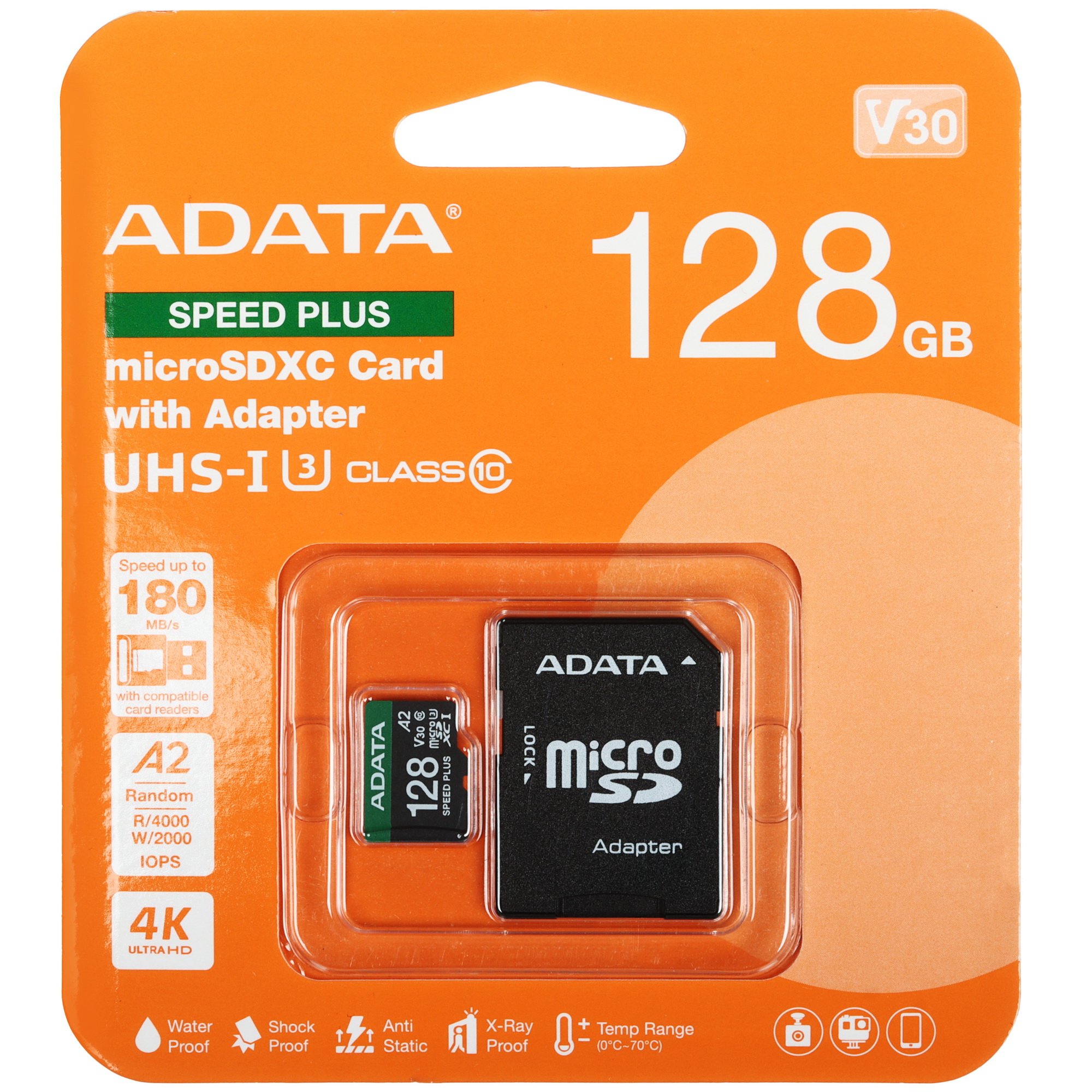 Карта памяти Adata SPEED PLUS microSDXC [UD128GUI3V30A2SP-RA1] типа microSDXC позволяет записывать и хранить данные общим объемом 128 ГБ. Классы A2, Class 10, UHS Class 3 и Video Class 30 обеспечивают запись со скоростью 160 Мбайт/сек и чтение с максимальной скоростью 180 Мбайт/сек.