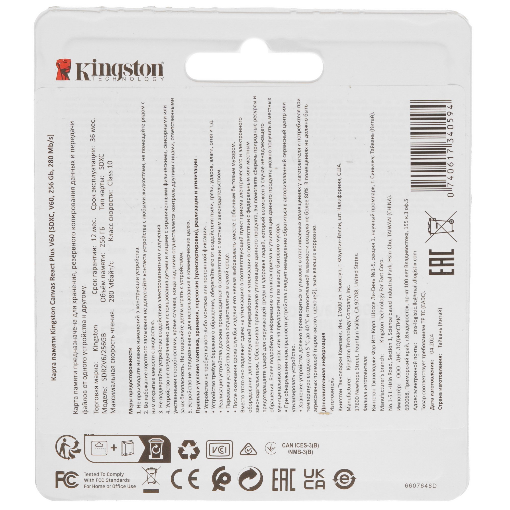 Карта памяти Kingston Canvas React Plus V60 SDXC 256 ГБ [SDR2V6/256GB] соответствует классам скорости Class 10, UHS Class 3 и Video Class 60. Изделие предназначено для фотокамер и других устройств.
