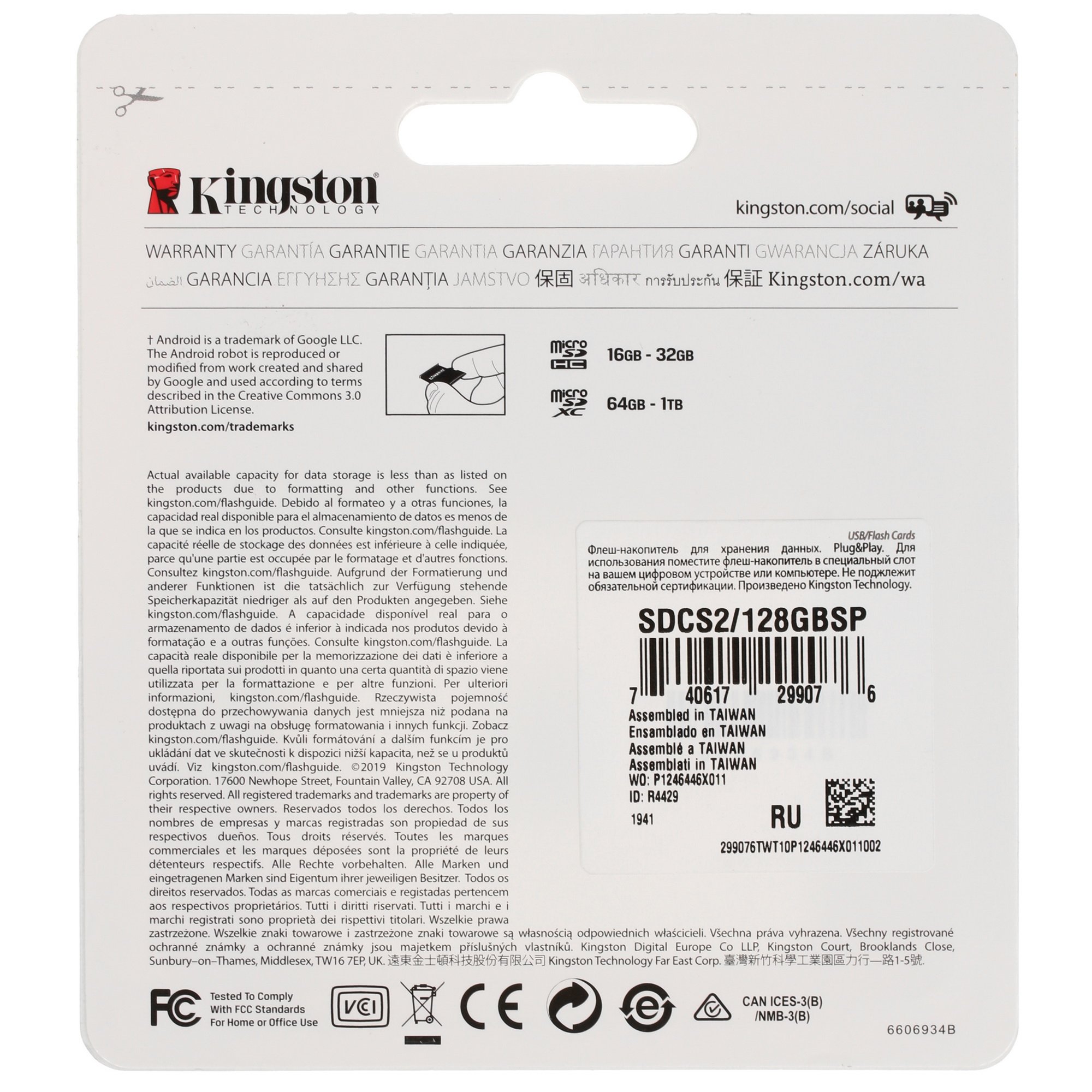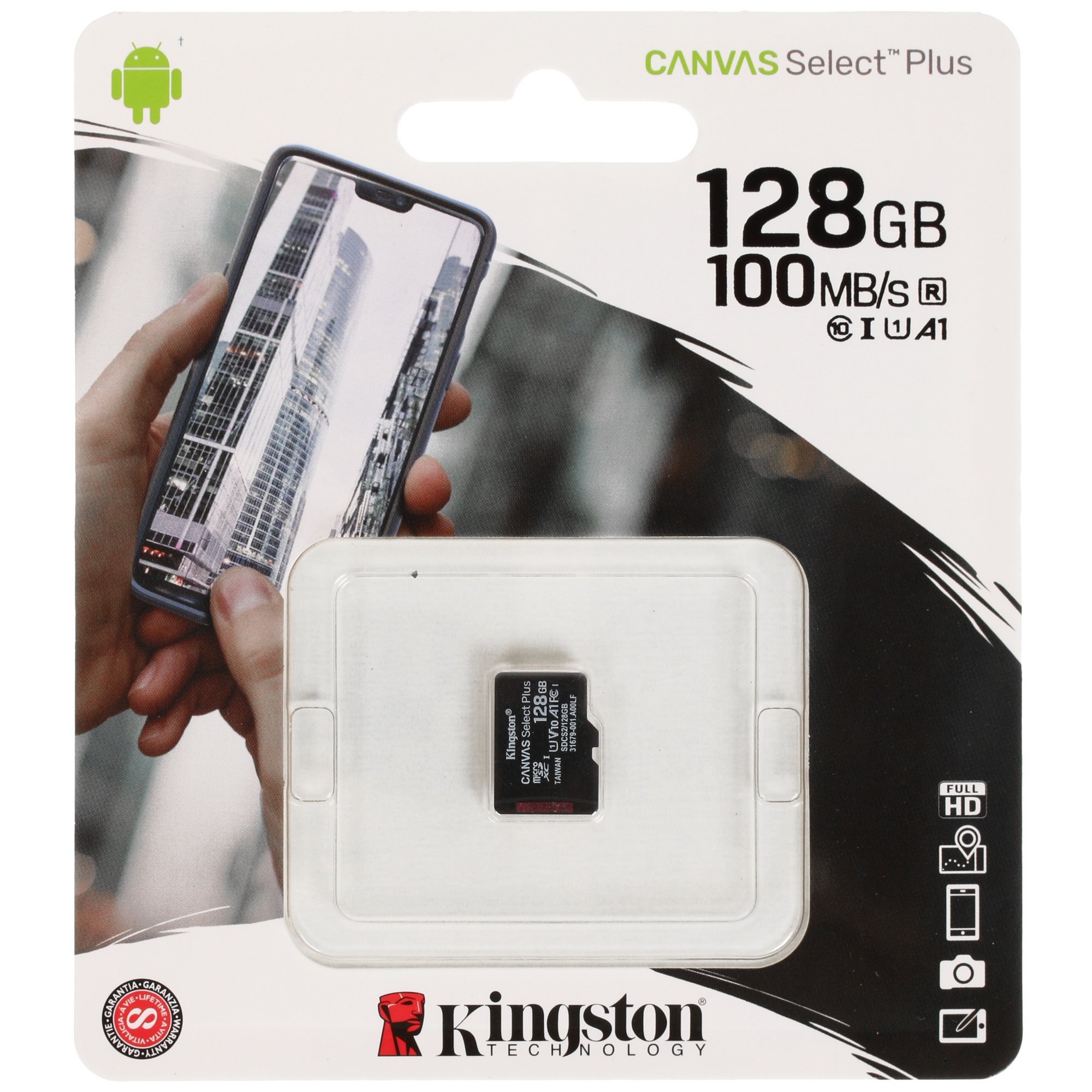 Карта памяти Kingston Canvas Select Plus − миниатюрная карта, обладающая производительностью класса A1, что делает ее идеальным приспособлением для использования в компьютерных устройствах, видео- и фотоаппаратуре. Объем карты microSDHC достигает 128 ГБ, что позволит записывать на нее достаточно много цифровой информации. Модель поддерживает совместимость с устройствами, функционирующими на Android.