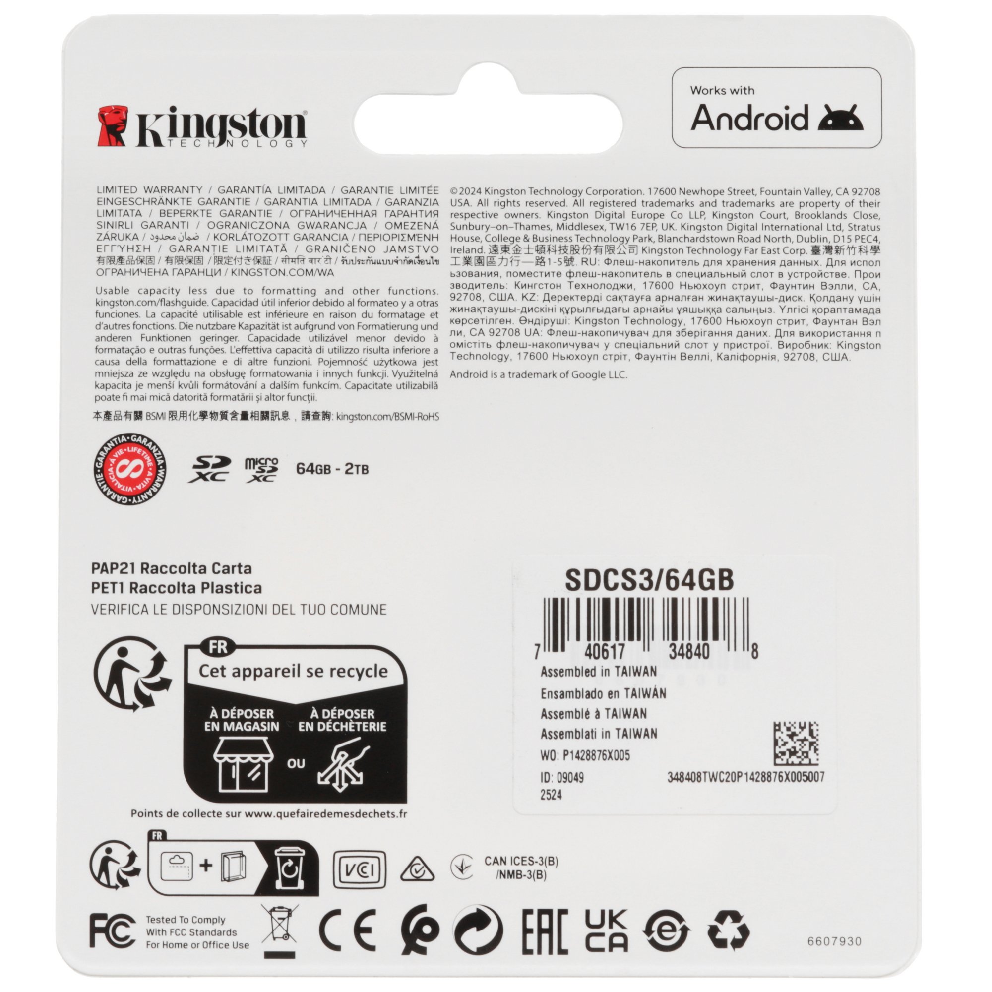 Карта памяти Kingston microSDXC 64 ГБ [SDCS3/64GB] пригодится владельцам смартфонов и других устройств. Модель соответствует классам скорости A1, UHS Class 1 и Video Class 10.