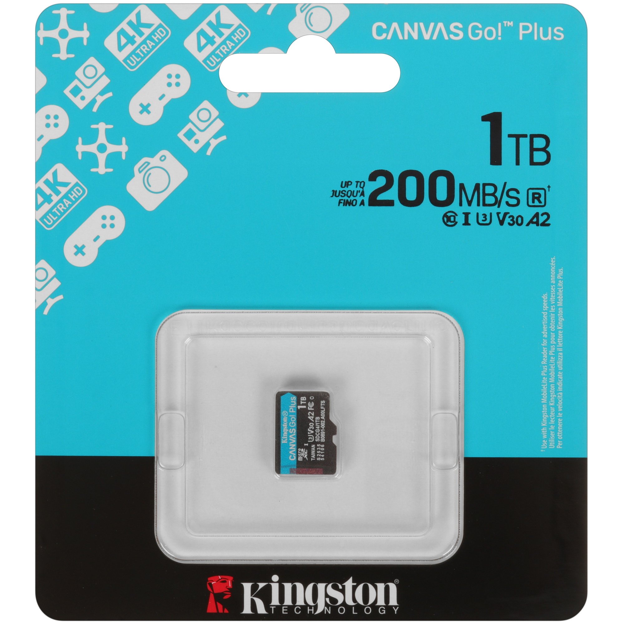 Карта памяти Kingston microSDXC 1000 ГБ [SDCG4/1TBSP] соответствует классам скорости A2, Class 10, UHS Class 3 и Video Class 30. Изделие предназначено для смартфонов, фотокамер и других устройств.