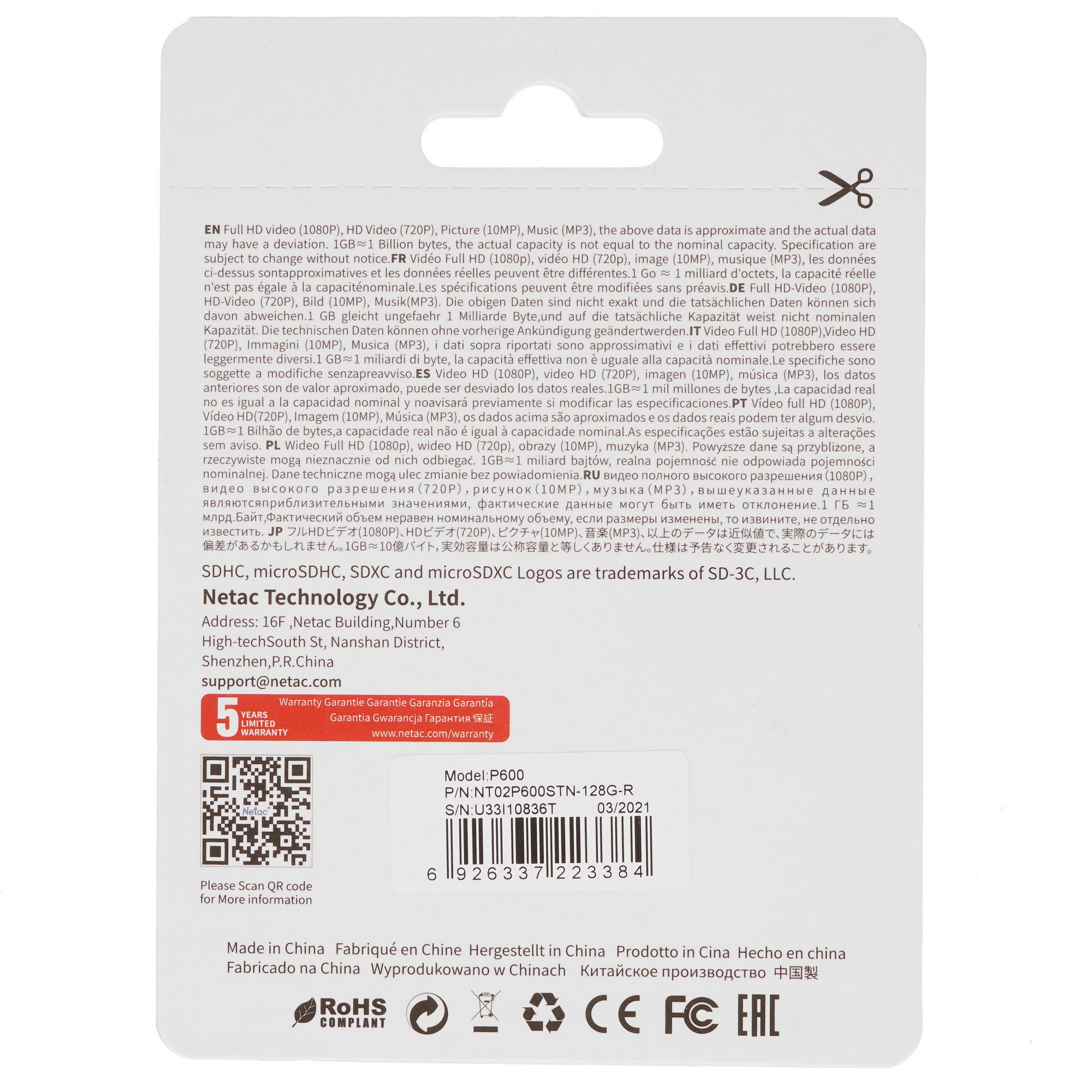 Флеш карта Netac P600 SDHC 128Gb U1/C10 up to 80Mb/s, retail pack