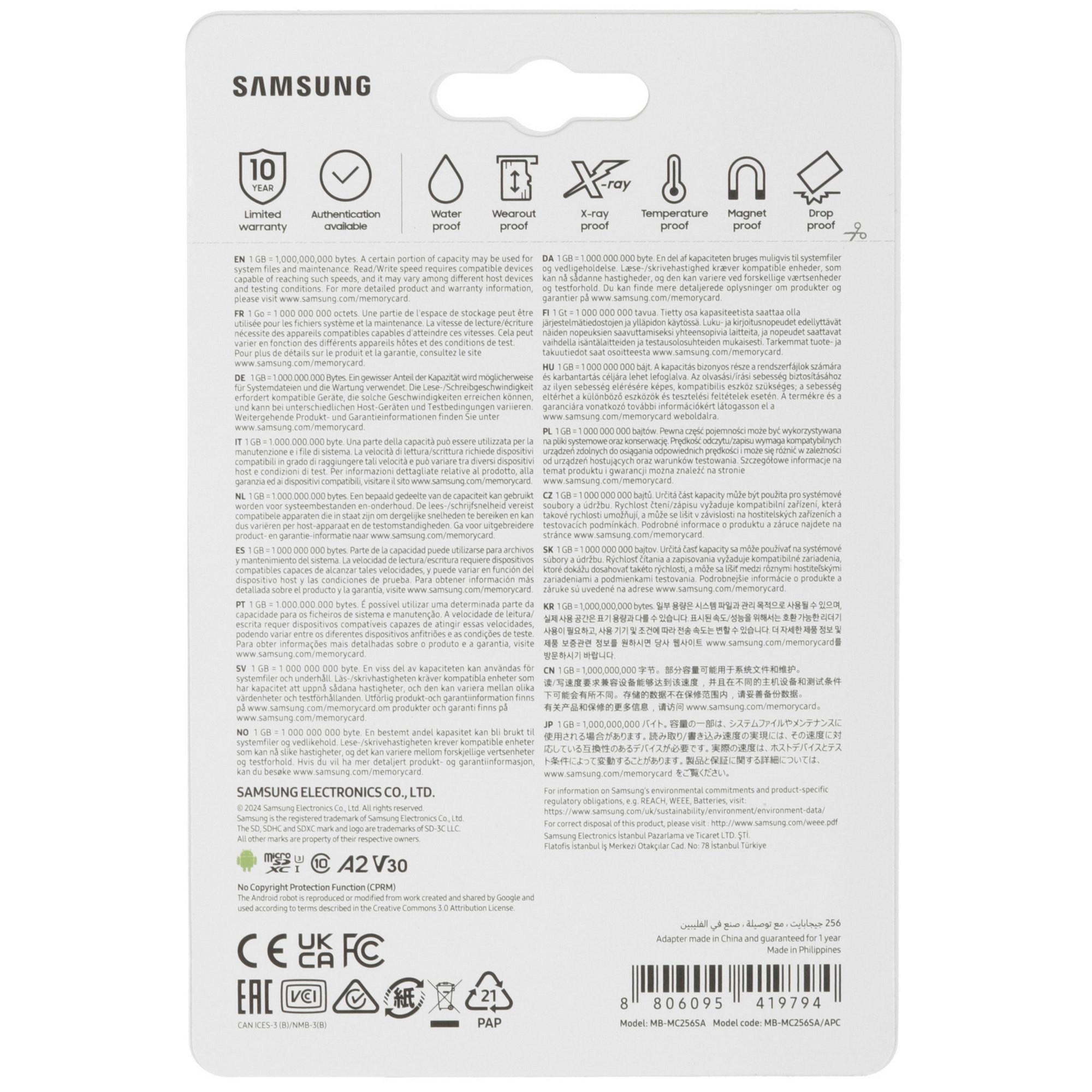 Карта памяти Samsung EVO Plus microSDXC 256 ГБ [MB-MC256SA/APC] класса A2/UHS Class 3/Video Class 30 читает данные со скоростью 160 Мбит/с. Эти показания обеспечивают мгновенную передачу файлов в высоком разрешении. В наборе идет адаптер для подключения в устройства со слотом SD. Устройство имеет рабочую температуру в диапазоне от – 25° до + 85° C. Напряжение питания карты составляет 3.6 Вт.