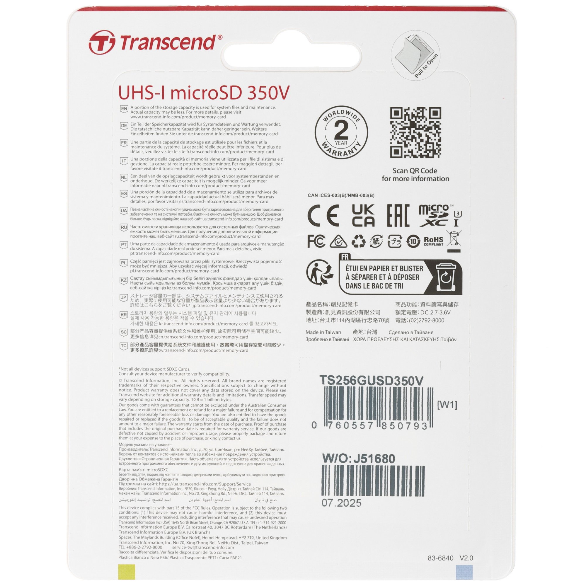 Диапазон рабочих температур карты памяти Transcend High Endurance 350V microSDXC 256 ГБ [TS256GUSD350V] – от -25 до 85 °C. Изделие подходит для интенсивной записи. Классы скорости модели – Class 10, UHS Class 3, Video Class 30.