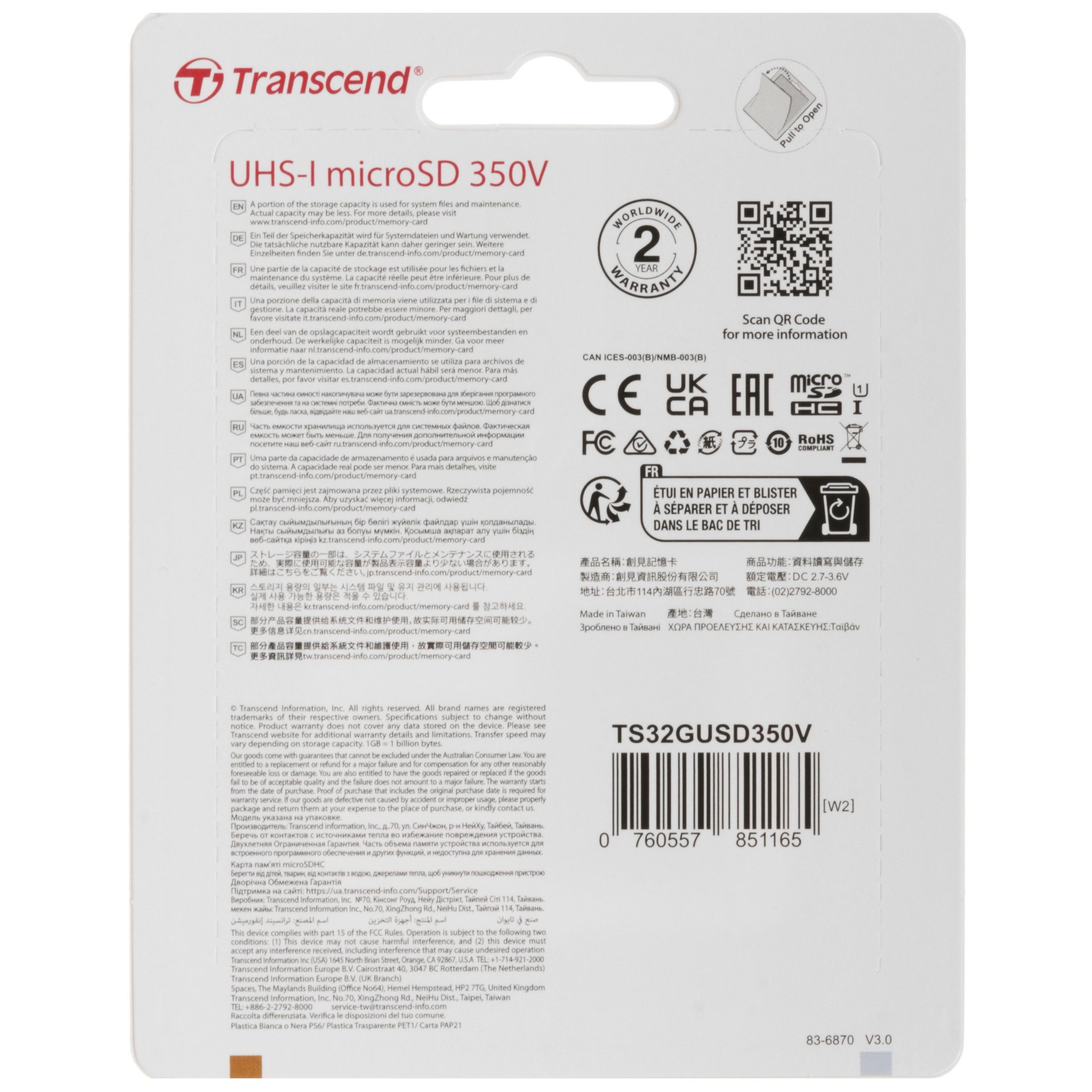 Диапазон рабочих температур карты памяти Transcend High Endurance 350V microSDXC 32 ГБ [TS32GUSD350V] – от -25 до 85 °C. Изделие подходит для интенсивной записи. Классы скорости модели – Class 10, UHS Class 3, Video Class 30.