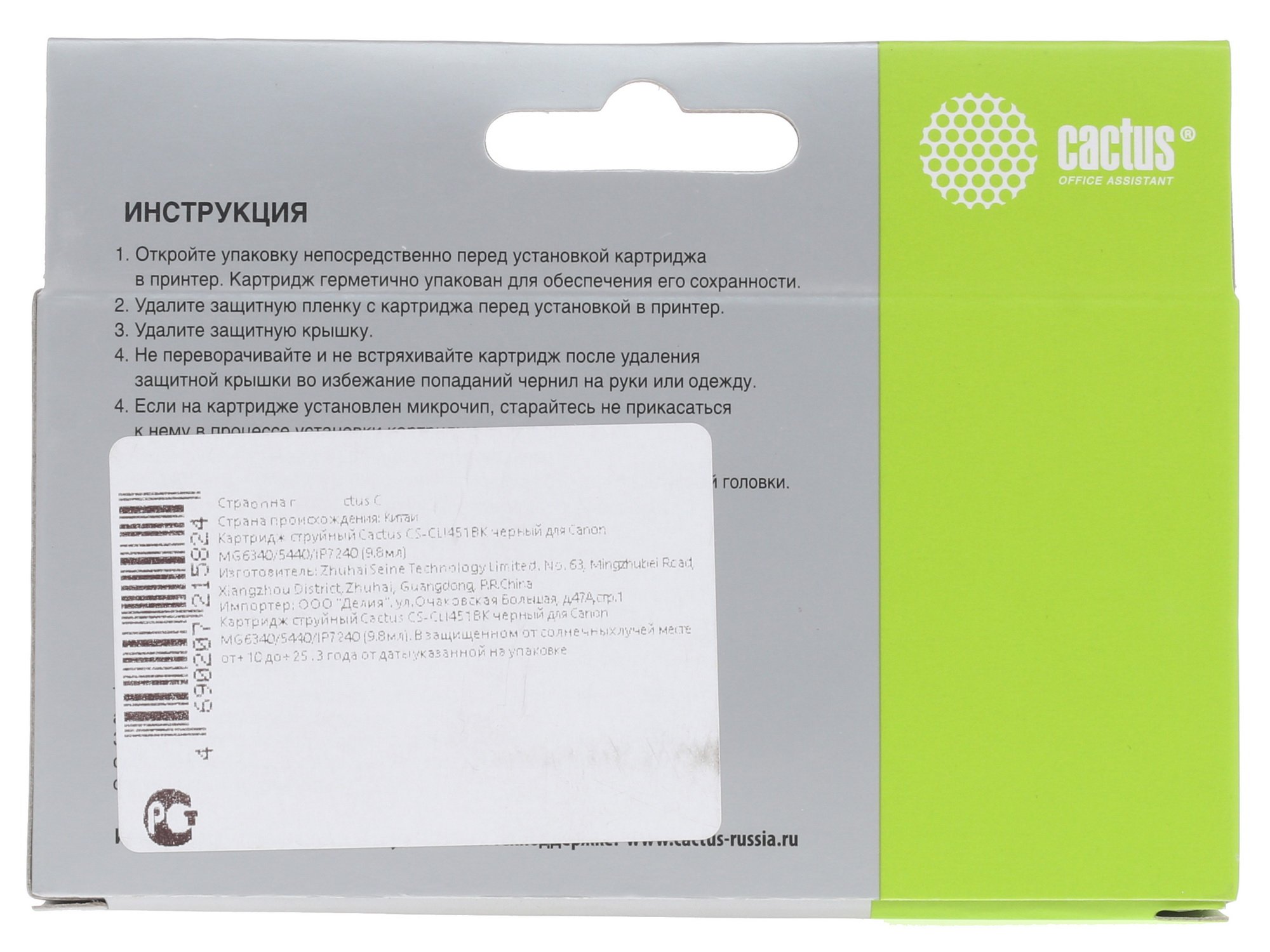 Картридж струйный Cactus CS-CLI451BK – изделие от крупного производителя. Оно обладает отличными характеристиками и обеспечит высокое качество печати. Компания давно занимается изготовлением расходных материалов и зарекомендовала себя с лучшей стороны.